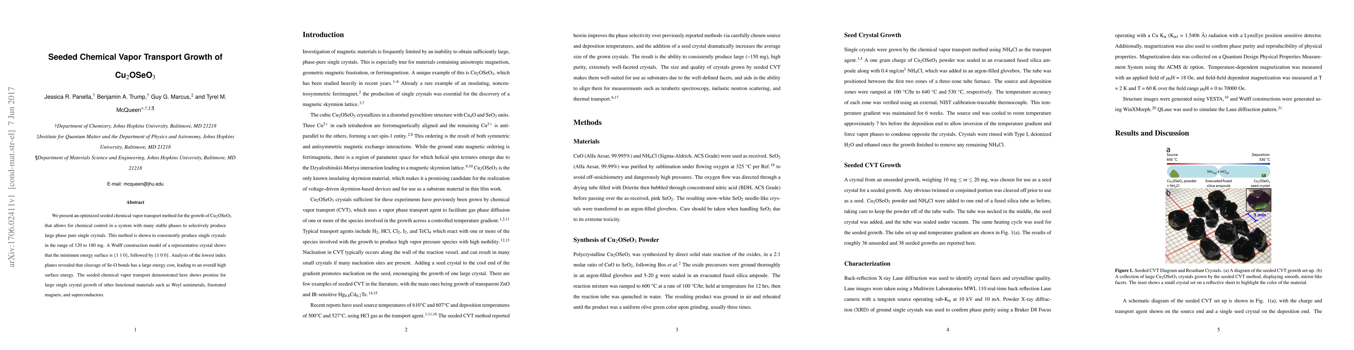 This paper optimizes a seeded chemical vapor transport method for growing large, phase-pure single crystals of Cu$_{2}$OSeO$_{3}$, achieving crystals of 120 to 180 mg. The method's success is attributed to the low surface energy of the {1 1 0} plane, and its potential for growing other functional materials is highlighted.
