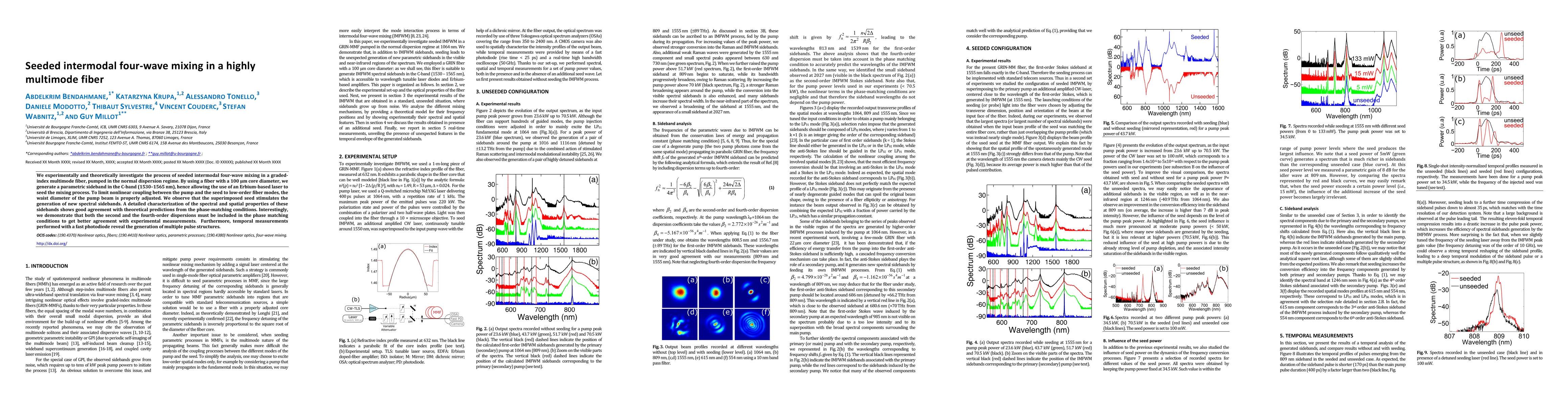 This paper investigates seeded intermodal four-wave mixing in a multimode fiber, demonstrating the generation of parametric sidebands in the C band with an Erbium-based laser seed. The study highlights the importance of considering both second and fourth-order dispersions for accurate phase matching, and reveals the formation of multiple pulse structures.