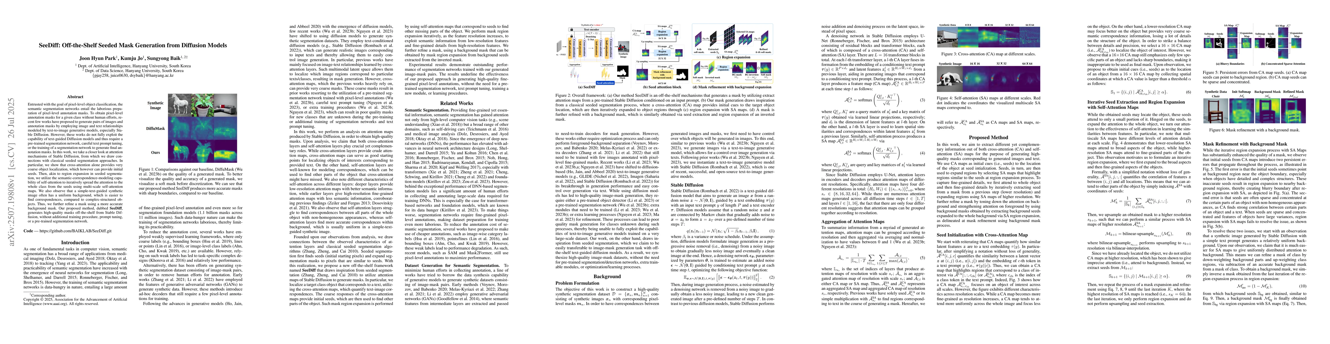 Entrusted with the goal of pixel-level object classification, the semantic segmentation networks entail the laborious preparation of pixel-level annotation masks. To obtain pixel-level annotation masks for a given class without human efforts, recent few works have proposed to generate pairs of images and annotation masks by employing image and text relationships modeled by text-to-image generative models, especially Stable Diffusion. However, these works do not fully exploit the capability of text-guided Diffusion models and thus require a pre-trained segmentation network, careful text prompt tuning, or the training of a segmentation network to generate final annotation masks. In this work, we take a closer look at attention mechanisms of Stable Diffusion, from which we draw connections with classical seeded segmentation approaches. In particular, we show that cross-attention alone provides very coarse object localization, which however can provide initial seeds. Then, akin to region expansion in seeded segmentation, we utilize the semantic-correspondence-modeling capability of self-attention to iteratively spread the attention to the whole class from the seeds using multi-scale self-attention maps. We also observe that a simple-text-guided synthetic image often has a uniform background, which is easier to find correspondences, compared to complex-structured objects. Thus, we further refine a mask using a more accurate background mask. Our proposed method, dubbed SeeDiff, generates high-quality masks off-the-shelf from Stable Diffusion, without additional training procedure, prompt tuning, or a pre-trained segmentation network.