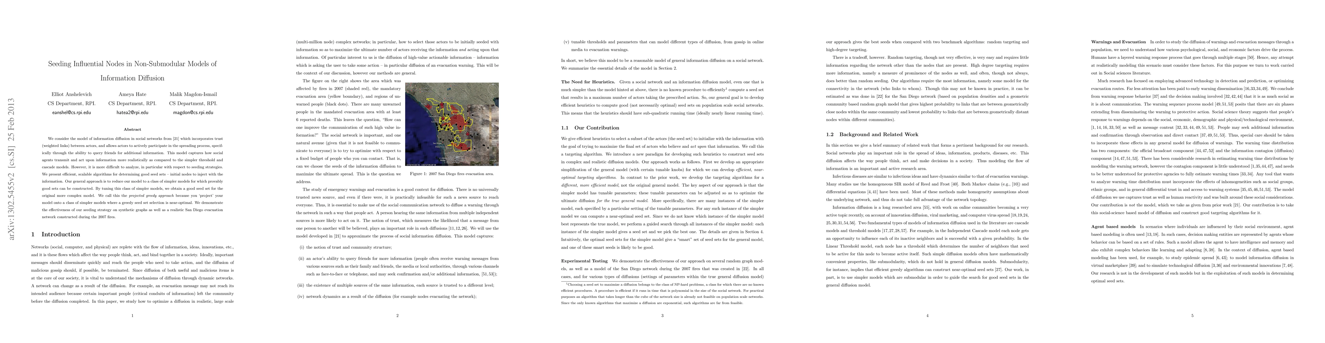 We consider the model of information diffusion in social networks from \cite{Hui2010a} which incorporates trust (weighted links) between actors, and allows actors to actively participate in the spreading process, specifically through the ability to query friends for additional information. This model captures how social agents transmit and act upon information more realistically as compared to the simpler threshold and cascade models. However, it is more difficult to analyze, in particular with respect to seeding strategies. We present efficient, scalable algorithms for determining good seed sets -- initial nodes to inject with the information. Our general approach is to reduce our model to a class of simpler models for which provably good sets can be constructed. By tuning this class of simpler models, we obtain a good seed set for the original more complex model. We call this the \emph{projected greedy approach} because you `project' your model onto a class of simpler models where a greedy seed set selection is near-optimal. We demonstrate the effectiveness of our seeding strategy on synthetic graphs as well as a realistic San Diego evacuation network constructed during the 2007 fires.