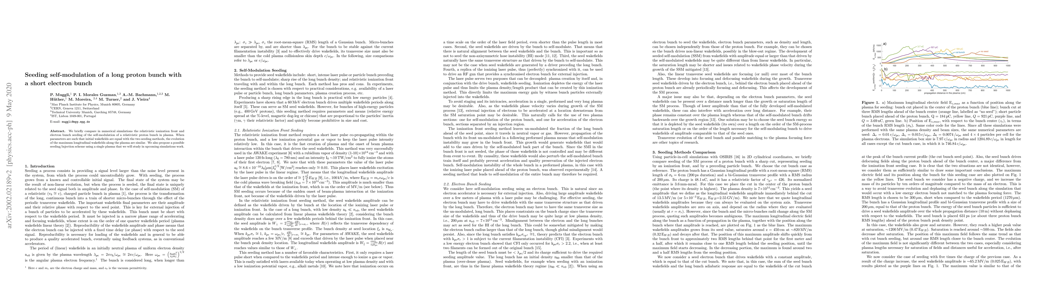 We briefly compare in numerical simulations the relativistic ionization front and electron bunch seeding of the self-modulation of a relativistic proton bunch in plasma. When parameters are such that initial wakefields are equal with the two seeding methods, the evolution of the maximum longitudinal wakefields along the plasma are similar. We also propose a possible seeding/injection scheme using a single plasma that we will study in upcoming simulations works.