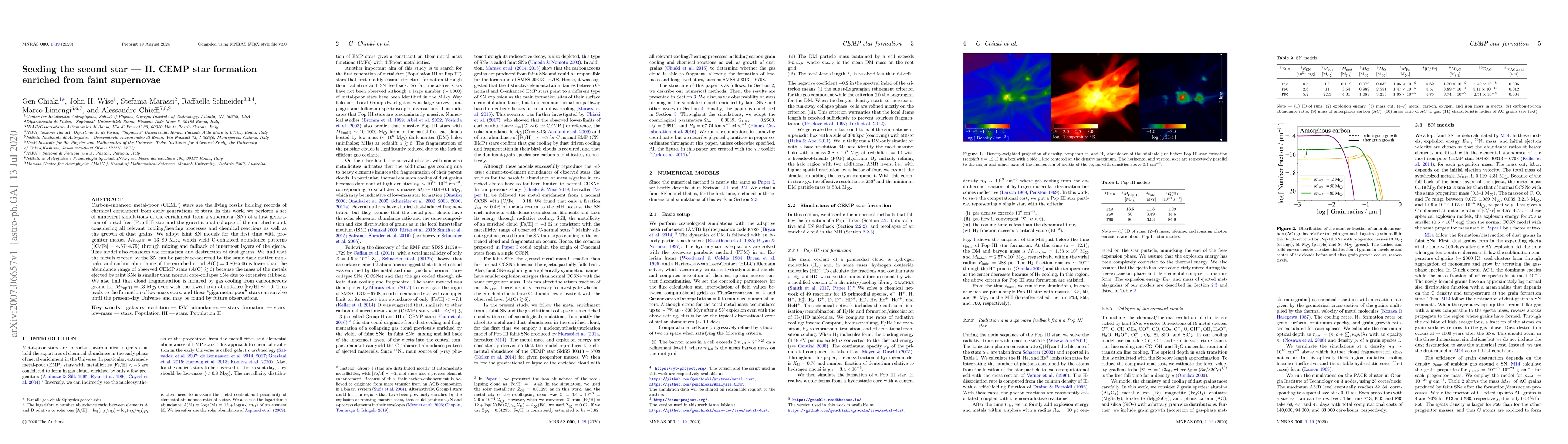 Carbon-enhanced metal-poor (CEMP) stars are the living fossils holding records of chemical enrichment from early generations of stars. In this work, we perform a set of numerical simulations of the enrichment from a supernova (SN) of a first generation of metal-free (Pop III) star and the gravitational collapse of the enriched cloud, considering all relevant cooling/heating processes and chemical reactions as well as the growth of dust grains. We adopt faint SN models for the first time with progenitor masses $M_{\rm PopIII} = 13$--$80 \ {\rm M}_{\bigodot}$, which yield C-enhanced abundance patterns (${\rm [C/Fe]} = 4.57$--$4.75$) through mixing and fallback of innermost layers of the ejecta. This model also considers the formation and destruction of dust grains. We find that the metals ejected by the SN can be partly re-accreted by the same dark matter minihalo, and carbon abundance of the enriched cloud $A({\rm C}) = 3.80$--$5.06$ is lower than the abundance range of observed CEMP stars ($A({\rm C}) \gtrsim 6$) because the mass of the metals ejected by faint SNe is smaller than normal core-collapse SNe due to extensive fallback. We also find that cloud fragmentation is induced by gas cooling from carbonaceous grains for $M_{\rm PopIII} = 13 \ {\rm M}_{\bigodot}$ even with the lowest iron abundance ${\rm [Fe/H]} \sim -9$. This leads to the formation of low-mass stars, and these ``giga metal-poor'' stars can survive until the present-day Universe and may be found by future observations.