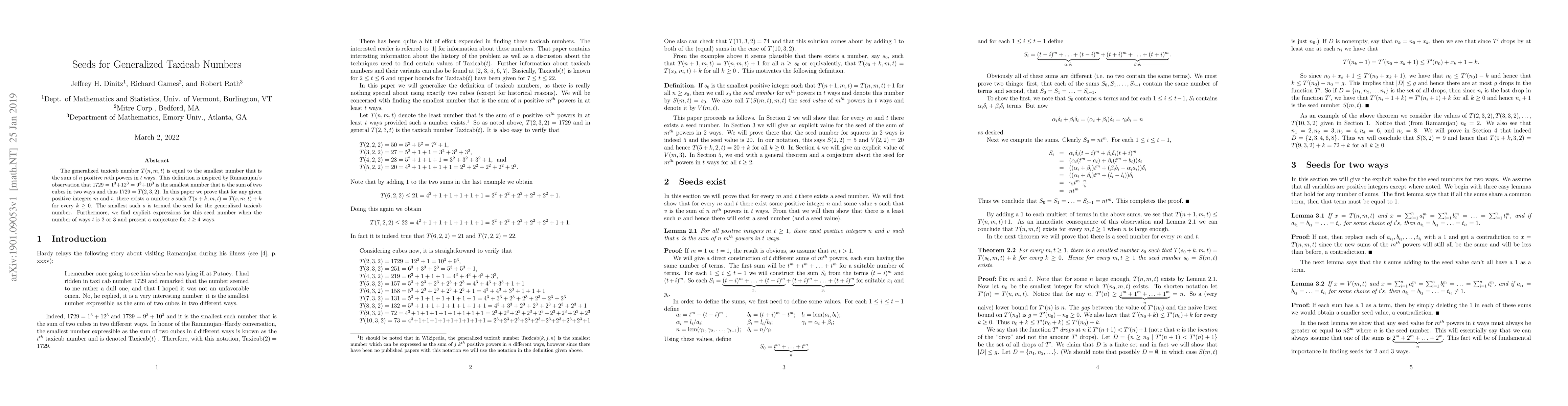 The generalized taxicab number $T(n,m,t)$ is equal to the smallest number that is the sum of $n$ positive $m$th powers in $t$ ways. This definition is inspired by Ramanujan's observation that $1729 = 1^3+ 12^3 =9^3 + 10^3 $ is the smallest number that is the sum of two cubes in two ways and thus $1729= T(2,3,2)$. In this paper we prove that for any given positive integers $m$ and $t$, there exists a number $s$ such $T(s+k,m,t) =T(s,m,t) +k$ for every $k \geq 0$. The smallest such $s$ is termed the seed for the generalized taxicab number. Furthermore, we find explicit expressions for this seed number when the number of ways $t$ is 2 or 3 and present a conjecture for $t \geq 4$ ways.