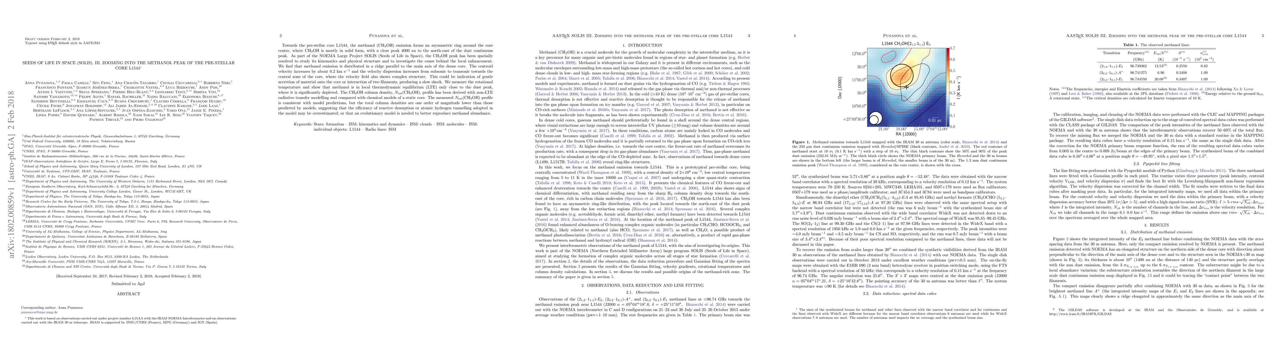 Towards the pre-stellar core L1544, the methanol (CH$_3$OH) emission forms an asymmetric ring around the core centre, where CH$_3$OH is mostly in solid form, with a clear peak 4000~au to the north-east of the dust continuum peak. As part of the NOEMA Large Project SOLIS (Seeds of Life in Space), the CH$_3$OH peak has been spatially resolved to study its kinematics and physical structure and to investigate the cause behind the local enhancement. We find that methanol emission is distributed in a ridge parallel to the main axis of the dense core. The centroid velocity increases by about 0.2~km~s$^{-1}$ and the velocity dispersion increases from subsonic to transonic towards the central zone of the core, where the velocity field also shows complex structure. This could be indication of gentle accretion of material onto the core or interaction of two filaments, producing a slow shock. We measure the rotational temperature and show that methanol is in local thermodynamic equilibrium (LTE) only close to the dust peak, where it is significantly depleted. The CH$_3$OH column density, $N_{tot}({\rm CH_3OH})$, profile has been derived with non-LTE radiative transfer modelling and compared with chemical models of a static core. The measured $N_{tot}({\rm CH_3OH})$ profile is consistent with model predictions, but the total column densities are one order of magnitude lower than those predicted by models, suggesting that the efficiency of reactive desorption or atomic hydrogen tunnelling adopted in the model may be overestimated; or that an evolutionary model is needed to better reproduce methanol abundance.