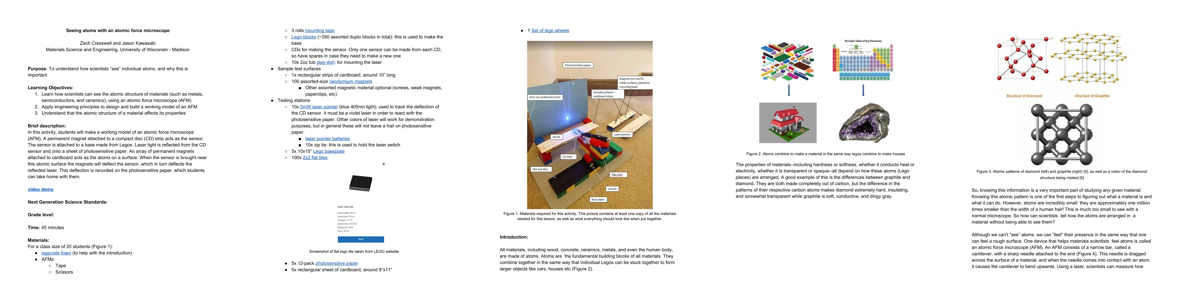 In this activity, students will make a working model of an atomic force microscope (AFM). A permanent magnet attached to a compact disc (CD) strip acts as the sensor. The sensor is attached to a base made from Legos. Laser light is reflected from the CD sensor and onto a sheet of photosensitive paper. An array of permanent magnets attached to cardboard acts as the atoms on a surface. When the sensor is brought near this atomic surface the magnets will deflect the sensor, which in turn deflects the reflected laser. This deflection is recorded on the photosensitive paper, which students can take home with them.