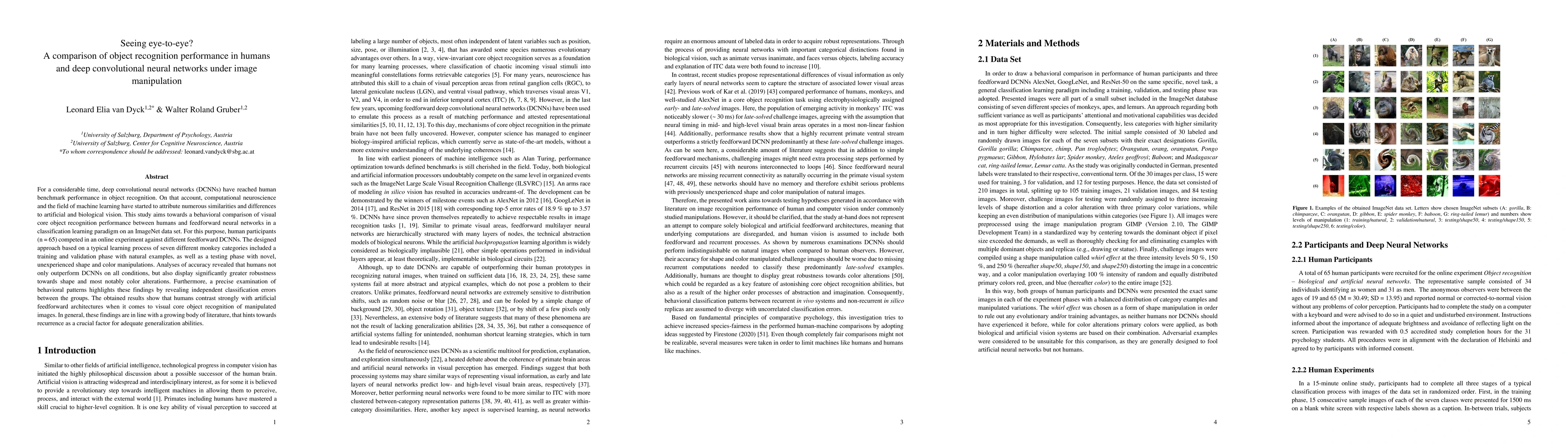 This study compares human and deep convolutional neural network (DCNN) performance in object recognition under image manipulation, finding that humans outperform DCNNs and show greater robustness, especially to color changes, suggesting that recurrence may enhance generalization abilities.