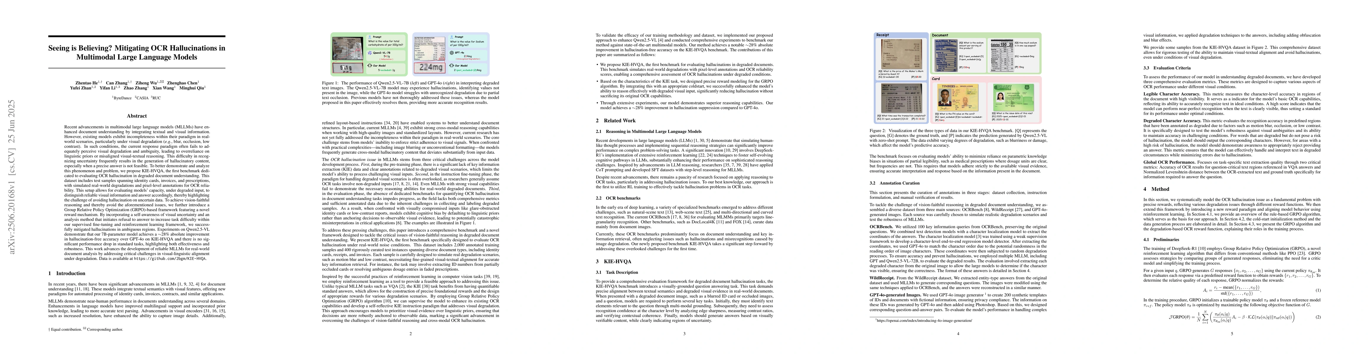 Recent advancements in multimodal large language models have enhanced document understanding by integrating textual and visual information. However, existing models exhibit incompleteness within their paradigm in real-world scenarios, particularly under visual degradation. In such conditions, the current response paradigm often fails to adequately perceive visual degradation and ambiguity, leading to overreliance on linguistic priors or misaligned visual-textual reasoning. This difficulty in recognizing uncertainty frequently results in the generation of hallucinatory content, especially when a precise answer is not feasible. To better demonstrate and analyze this phenomenon and problem, we propose KIE-HVQA, the first benchmark dedicated to evaluating OCR hallucination in degraded document understanding. This dataset includes test samples spanning identity cards and invoices, with simulated real-world degradations for OCR reliability. This setup allows for evaluating models' capacity, under degraded input, to distinguish reliable visual information and answer accordingly, thereby highlighting the challenge of avoiding hallucination on uncertain data. To achieve vision-faithful reasoning and thereby avoid the aforementioned issues, we further introduce a GRPO-based framework featuring a novel reward mechanism. By incorporating a self-awareness of visual uncertainty and an analysis method that initiates refusal to answer to increase task difficulty within our supervised fine-tuning and reinforcement learning framework, we successfully mitigated hallucinations in ambiguous regions. Experiments on Qwen2.5-VL demonstrate that our 7B-parameter model achieves a 22\% absolute improvement in hallucination-free accuracy over GPT-4o on KIE-HVQA and there is no significant performance drop in standard tasks, highlighting both effectiveness and robustness.