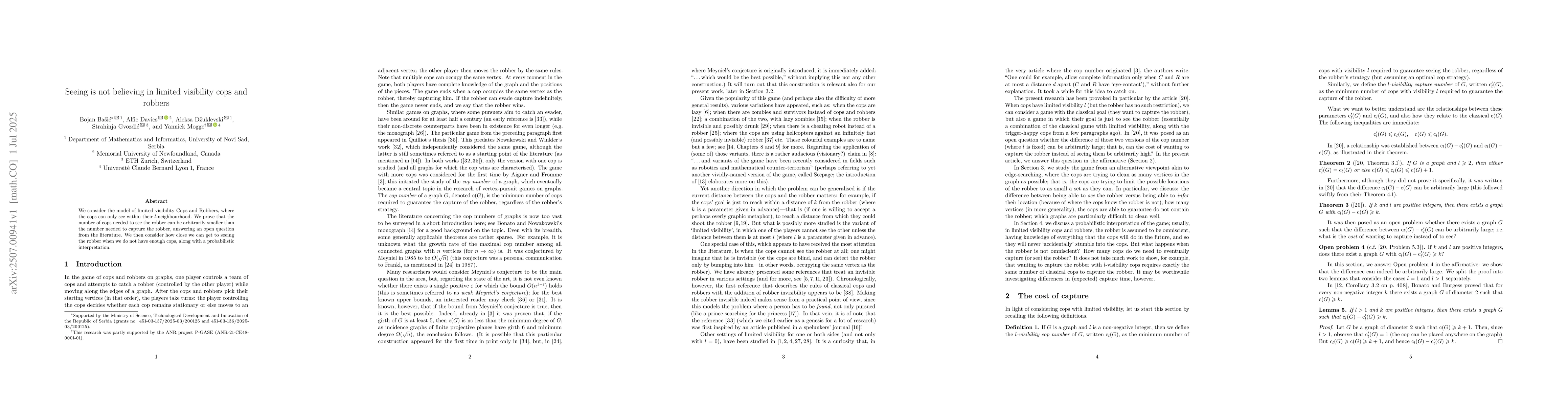 We consider the model of limited visibility Cops and Robbers, where the cops can only see within their $l$-neighbourhood. We prove that the number of cops needed to see the robber can be arbitrarily smaller than the number needed to capture the robber, answering an open question from the literature. We then consider how close we can get to seeing the robber when we do not have enough cops, along with a probabilistic interpretation.