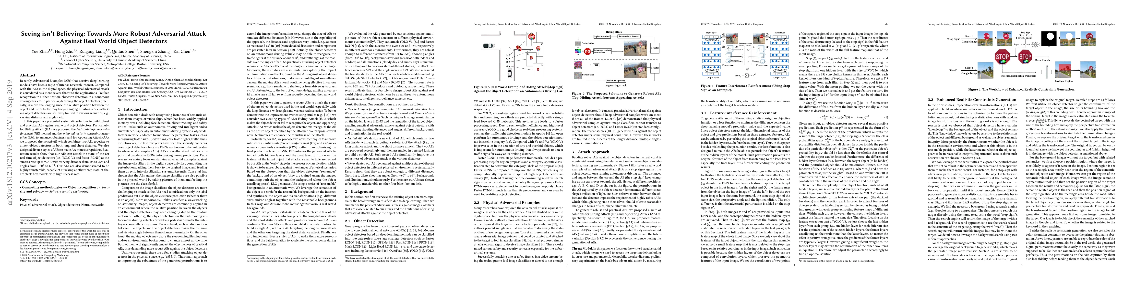 In this paper, we presented systematic solutions to build robust and practical AEs against real world object detectors. Particularly, for Hiding Attack (HA), we proposed the feature-interference reinforcement (FIR) method and the enhanced realistic constraints generation (ERG) to enhance robustness, and for Appearing Attack (AA), we proposed the nested-AE, which combines two AEs together to attack object detectors in both long and short distance. We also designed diverse styles of AEs to make AA more surreptitious. Evaluation results show that our AEs can attack the state-of-the-art real-time object detectors (i.e., YOLO V3 and faster-RCNN) at the success rate up to 92.4% with varying distance from 1m to 25m and angles from -60{\deg} to 60{\deg}. Our AEs are also demonstrated to be highly transferable, capable of attacking another three state-of-the-art black-box models with high success rate.