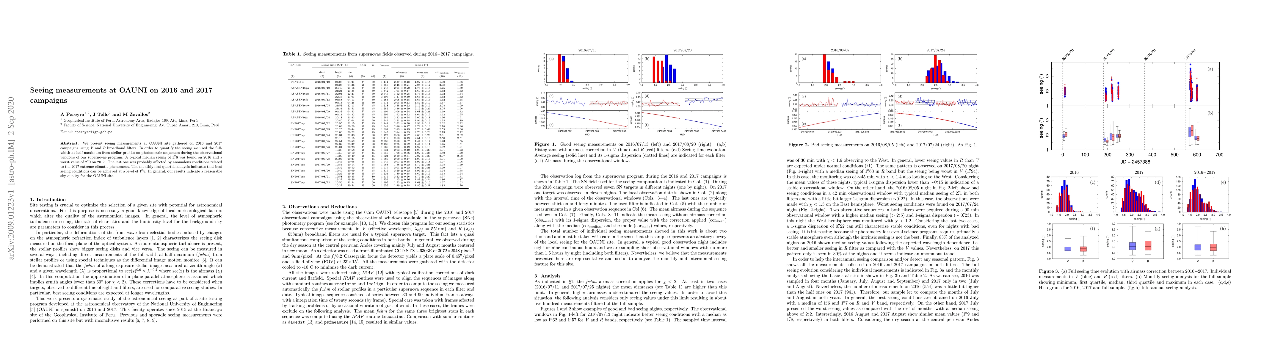 We present seeing measurements at OAUNI site gathered on 2016 and 2017 campaigns using V and R broadband filters. In order to quantify the seeing we used the full-width-at-half-maximum from stellar profiles on photometric sequences during the observational windows of our supernovae program. A typical median seeing of 1.8 arcsec was found on 2016 and a worst value of 2.0 arcsec on 2017. The last one was probably affected by anomalous conditions related to the 2017 extreme climatic phenomena. The monthly first quartile analysis indicates that best seeing conditions can be achieved at a level of 1.5 arcsec. In general, our results indicate a reasonable sky quality for the OAUNI site.