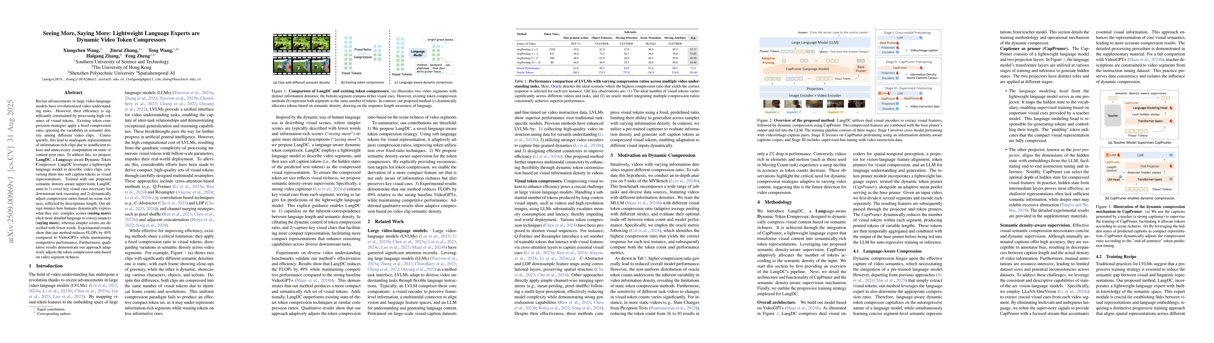 Recent advancements in large video-language models have revolutionized video understanding tasks. However, their efficiency is significantly constrained by processing high volumes of visual tokens. Existing token compression strategies apply a fixed compression ratio, ignoring the variability in semantic density among different video clips. Consequently, this lead to inadequate representation of information-rich clips due to insufficient tokens and unnecessary computation on static or content-poor ones. To address this, we propose LangDC, a Language-aware Dynamic Token Compressor. LangDC leverages a lightweight language model to describe video clips, converting them into soft caption tokens as visual representations. Trained with our proposed semantic density-aware supervision, LangDC aims to 1) cover key visual cues necessary for downstream task reasoning and 2) dynamically adjust compression ratios based on scene richness, reflected by descriptions length. Our design mimics how humans dynamically express what they see: complex scenes (seeing more) elicit more detailed language to convey nuances (saying more), whereas simpler scenes are described with fewer words. Experimental results show that our method reduces FLOPs by 49% compared to VideoGPT+ while maintaining competitive performance. Furthermore, qualitative results demonstrate our approach adaptively adjusts the token compression ratio based on video segment richness.