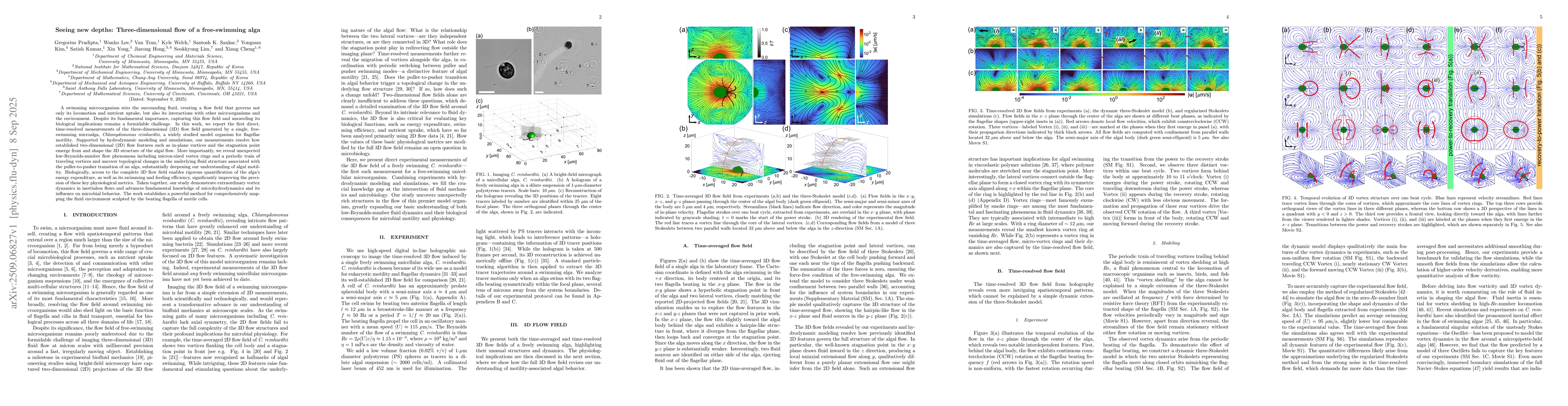 A swimming microorganism stirs the surrounding fluid, creating a flow field that governs not only its locomotion and nutrient uptake, but also its interactions with other microorganisms and the environment. Despite its fundamental importance, capturing this flow field and unraveling its biological implications remains a formidable challenge. In this work, we report the first direct, time-resolved measurements of the three-dimensional (3D) flow field generated by a single, free-swimming microalga, Chlamydomonas reinhardtii, a widely studied model organism for flagellar motility. Supported by hydrodynamic modeling and simulations, our measurements resolve how established two-dimensional (2D) flow features such as in-plane vortices and the stagnation point emerge from and shape the 3D structure of the algal flow. More importantly, we reveal unexpected low-Reynolds-number flow phenomena including micron-sized vortex rings and a periodic train of traveling vortices and uncover topological changes in the underlying fluid structure associated with the puller-to-pusher transition of an alga, substantially deepening our understanding of algal motility. Biologically, access to the complete 3D flow field enables rigorous quantification of the alga's energy expenditure, as well as its swimming and feeding efficiency, significantly improving the precision of these key physiological metrics. Taken together, our study demonstrate extraordinary vortex dynamics in inertialess flows and advances fundamental knowledge of microhydrodynamics and its influence on microbial behavior. The work establishes a powerful method for comprehensively mapping the fluid environment sculpted by the beating flagella of motile cells.