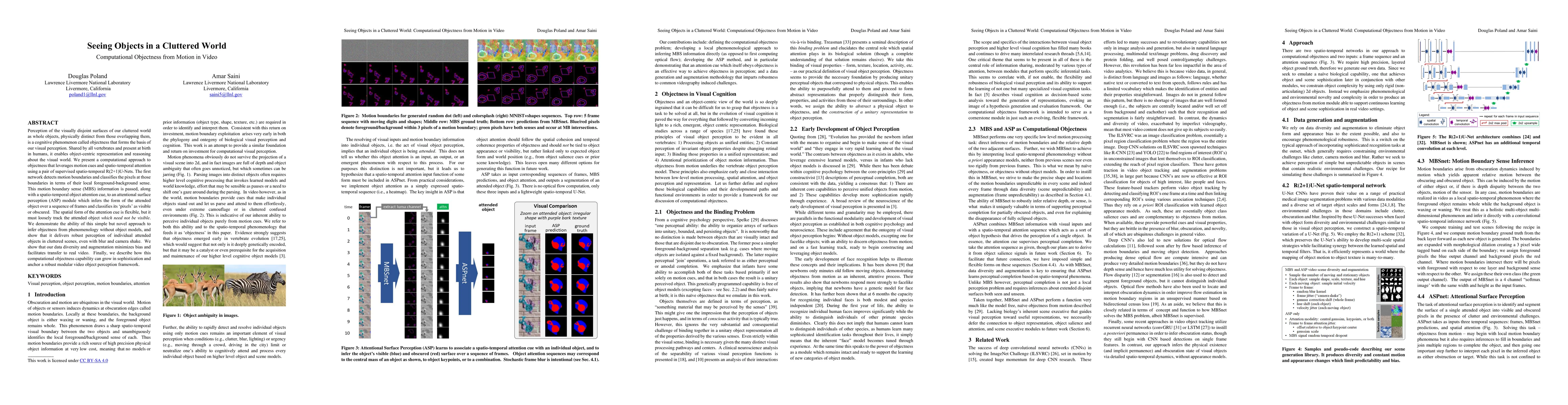 This paper presents a computational model leveraging motion cues and spatio-temporal attention to infer objectness in cluttered scenes, using supervised spatio-temporal R(2+1)U-Nets. The model demonstrates robust perception of individual objects in dynamic, cluttered environments without relying on pre-defined object models.