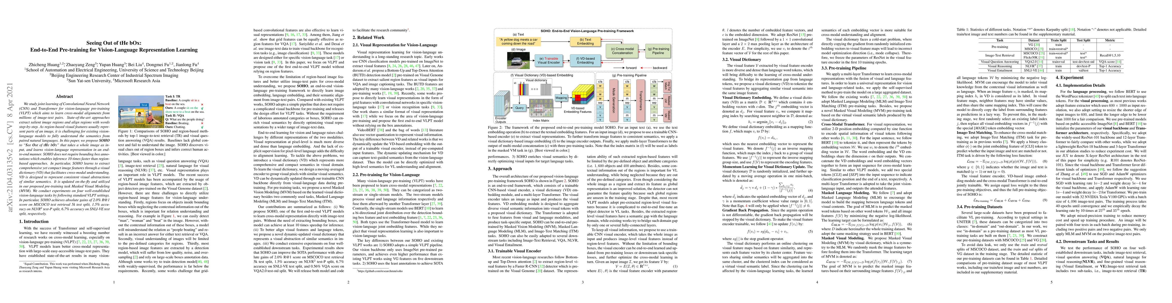 This paper proposes SOHO, an end-to-end pre-training method for vision-language representation learning that uses whole images instead of region-based features, achieving faster inference and better cross-modal understanding through a visual dictionary and Masked Visual Modeling task. SOHO demonstrates significant improvements across four vision-language tasks.
