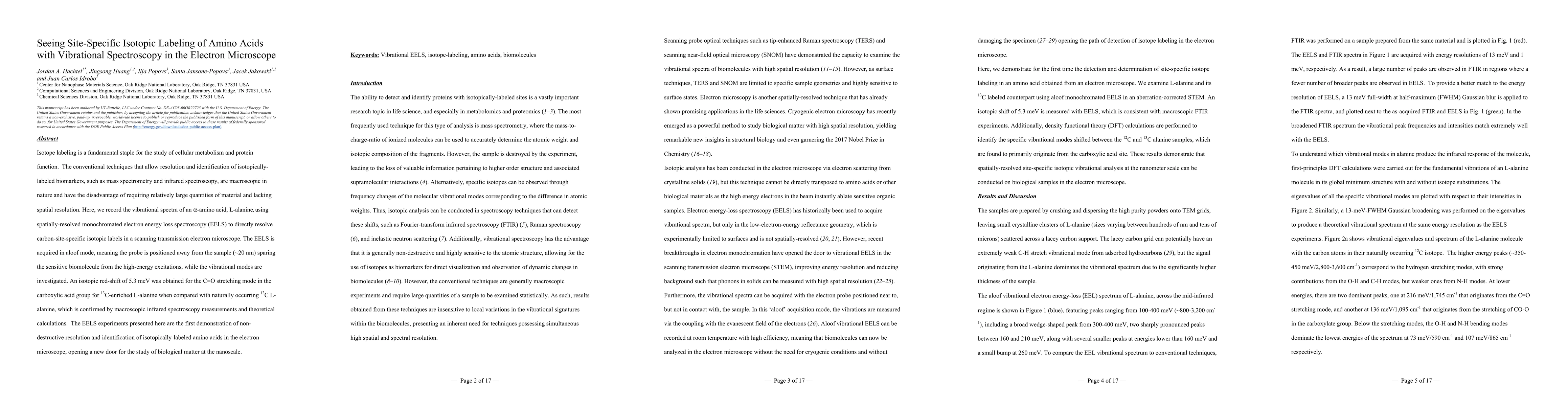This paper demonstrates the use of spatially-resolved monochromated electron energy loss spectroscopy (EELS) in a scanning transmission electron microscope to identify carbon-site-specific isotopic labels in L-alanine, achieving a non-destructive resolution of isotopically-labeled amino acids at the nanoscale. The technique reveals an isotopic red-shift of 5.3 meV for the C=O stretching mode, validated by infrared spectroscopy and theoretical calculations.