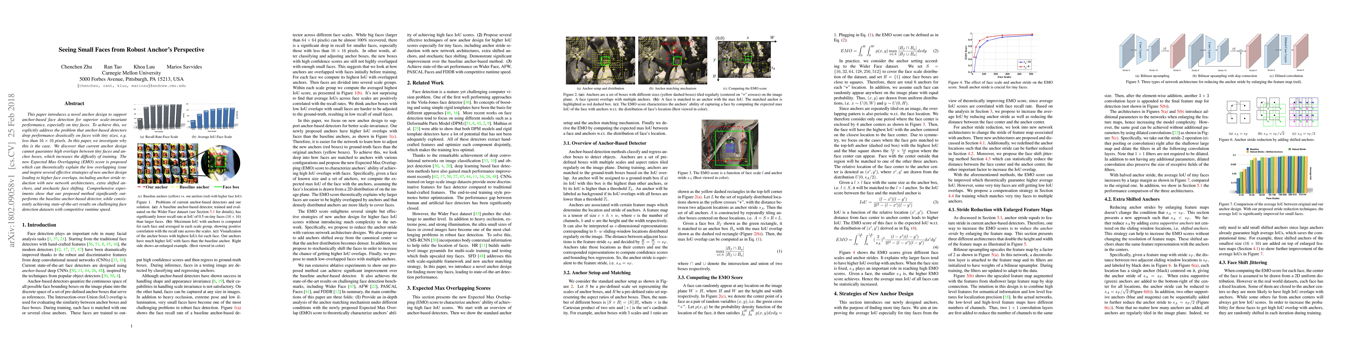 This paper presents a new anchor design for anchor-based face detection, addressing performance drop on tiny faces. It introduces the Expected Max Overlapping (EMO) score to explain low overlapping issues and proposes strategies like reduced anchor stride, extra shifted anchors, and stochastic face shifting. Results show significant performance improvement on challenging face detection datasets with competitive runtime speed.