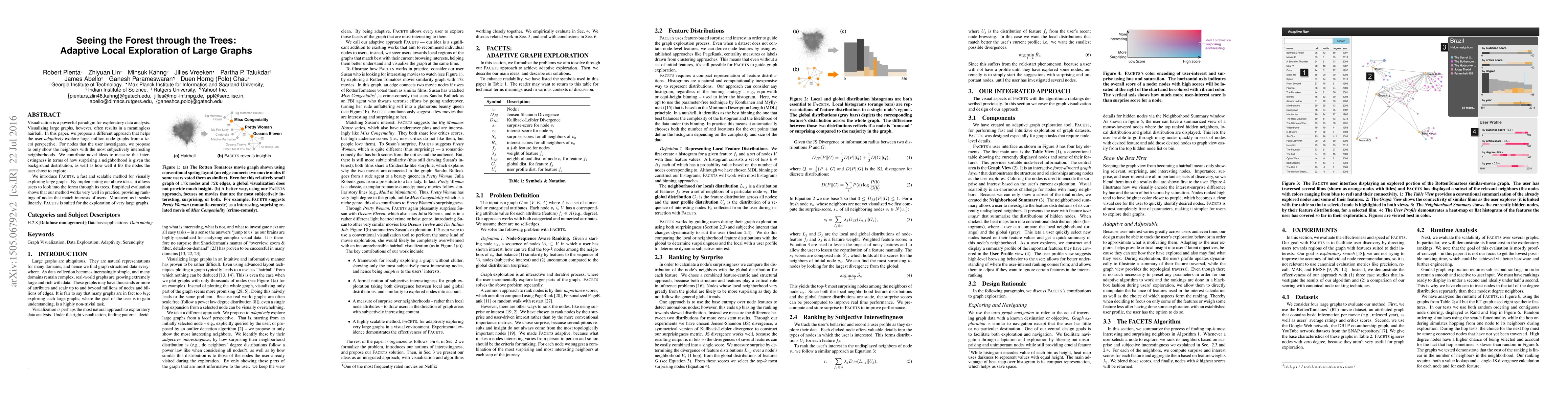 This paper proposes FACETS, a scalable method for adaptively exploring large million-node graphs by focusing on locally interesting neighborhoods, measured by surprisingness and fit to user-selected nodes. Empirical evaluations show FACETS effectively aligns with user interests and scales linearly for large graph exploration.