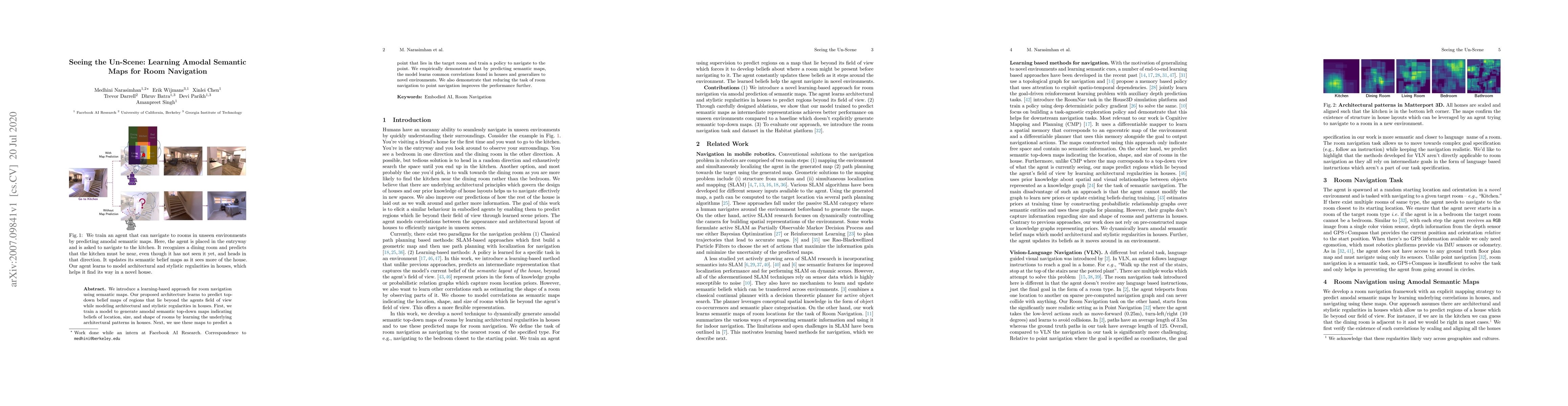 This paper proposes a learning-based approach for room navigation that generates amodal semantic maps predicting unseen room regions. The model learns architectural patterns to generalize to new environments, and navigating to predicted points within rooms improves performance.