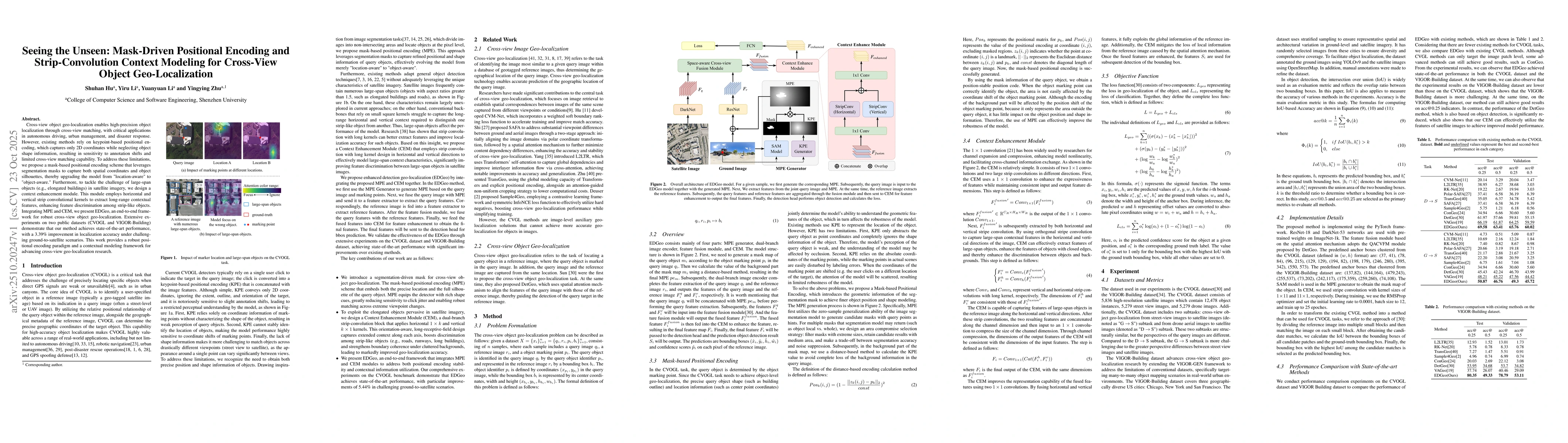 EDGeo introduces a mask-based positional encoding approach that outperforms traditional keypoint-based methods, combined with a context enhancement module that leverages global reference image information for more accurate cross-view object localization.