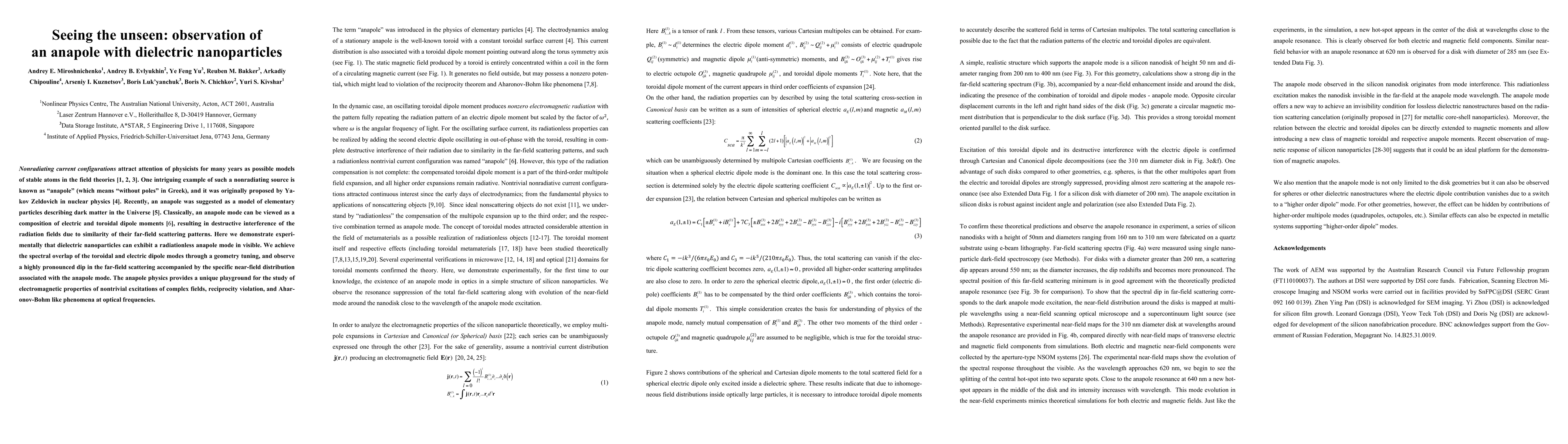 This paper experimentally demonstrates the existence of an anapole mode in dielectric nanoparticles, achieving spectral overlap of electric and toroidal dipole modes to produce a radiationless state. The study reveals a significant dip in far-field scattering and specific near-field distributions, highlighting potential applications in studying electromagnetic properties and phenomena at optical frequencies.