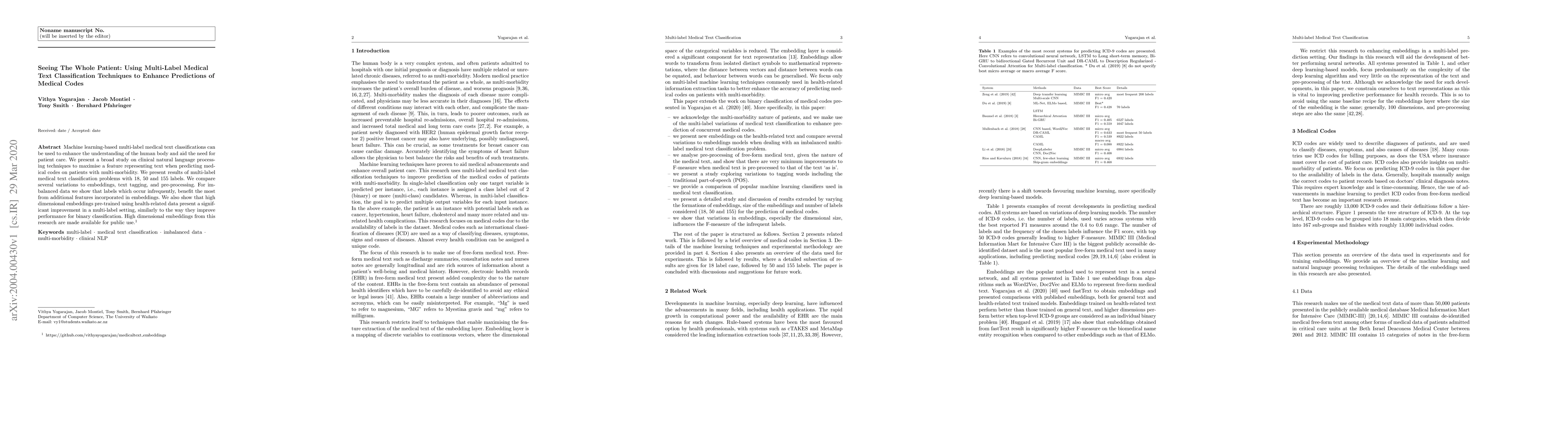 This paper explores multi-label medical text classification techniques to improve predictions of medical codes for patients with multi-morbidity. It demonstrates that high-dimensional embeddings pre-trained on health-related data significantly enhance performance, especially for infrequent labels, and makes these embeddings available for public use.