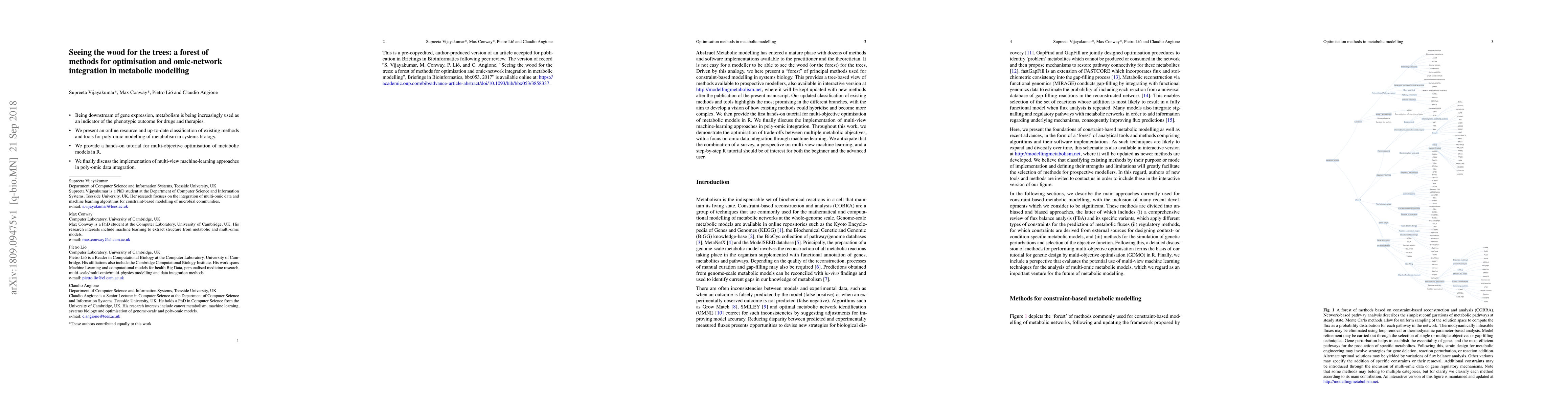 Metabolic modelling has entered a mature phase with dozens of methods and software implementations available to the practitioner and the theoretician. It is not easy for a modeller to be able to see the wood (or the forest) for the trees. Driven by this analogy, we here present a "forest" of principal methods used for constraint-based modelling in systems biology. This provides a tree-based view of methods available to prospective modellers, also available in interactive version at http://modellingmetabolism.net, where it will be kept updated with new methods after the publication of the present manuscript. Our updated classification of existing methods and tools highlights the most promising in the different branches, with the aim to develop a vision of how existing methods could hybridise and become more complex. We then provide the first hands-on tutorial for multi-objective optimisation of metabolic models in R. We finally discuss the implementation of multi-view machine-learning approaches in poly-omic integration. Throughout this work, we demonstrate the optimisation of trade-offs between multiple metabolic objectives, with a focus on omic data integration through machine learning. We anticipate that the combination of a survey, a perspective on multi-view machine learning, and a step-by-step R tutorial should be of interest for both the beginner and the advanced user.