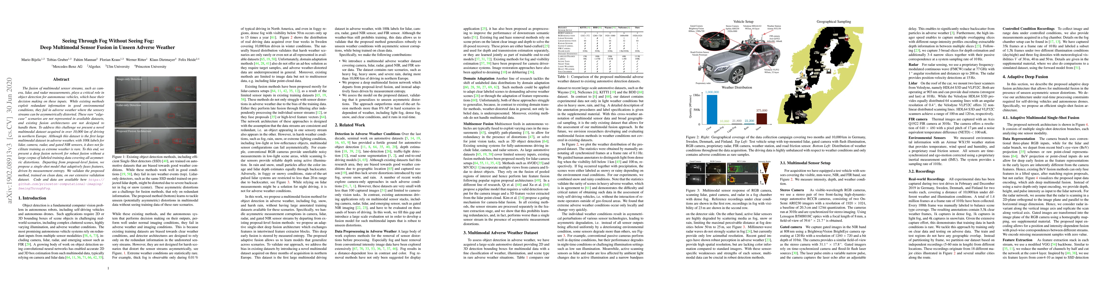 This paper presents a novel deep fusion network for multimodal sensor integration in unseen adverse weather conditions, addressing the lack of training data for extreme scenarios. The authors introduce a new dataset and a single-shot adaptive fusion model driven by measurement entropy, validated on their extensive validation dataset.