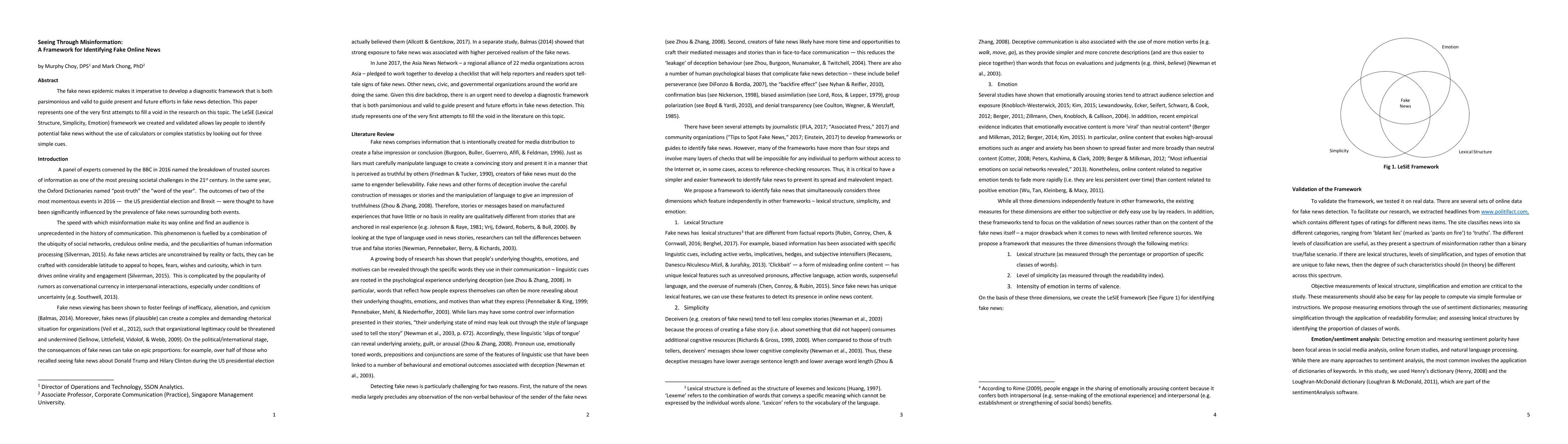 The fake news epidemic makes it imperative to develop a diagnostic framework that is both parsimonious and valid to guide present and future efforts in fake news detection. This paper represents one of the very first attempts to fill a void in the research on this topic. The LeSiE (Lexical Structure, Simplicity, Emotion) framework we created and validated allows lay people to identify potential fake news without the use of calculators or complex statistics by looking out for three simple cues.