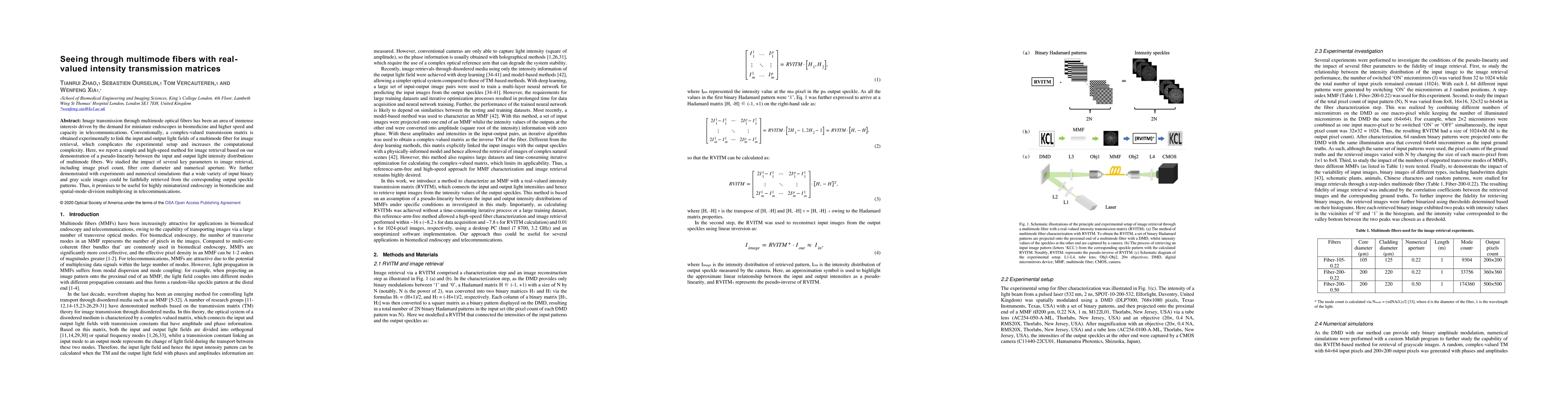 This paper presents a simplified method for retrieving images transmitted through multimode optical fibers using real-valued intensity matrices, which leverages pseudo-linearity between input and output light intensity distributions. The method promises high-speed and miniaturized applications in biomedicine and telecommunications.