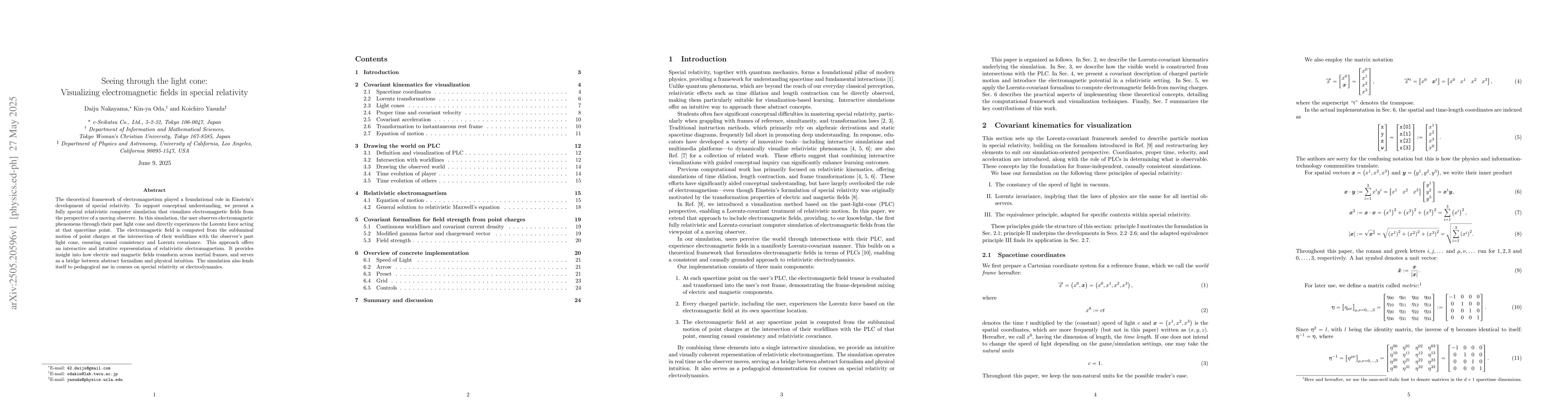 This simulation visualizes electromagnetic fields in special relativity, allowing observers to experience Lorentz force transformations and gain insight into relativistic electromagnetism. It offers an interactive and intuitive representation of the subject, useful for pedagogical purposes.