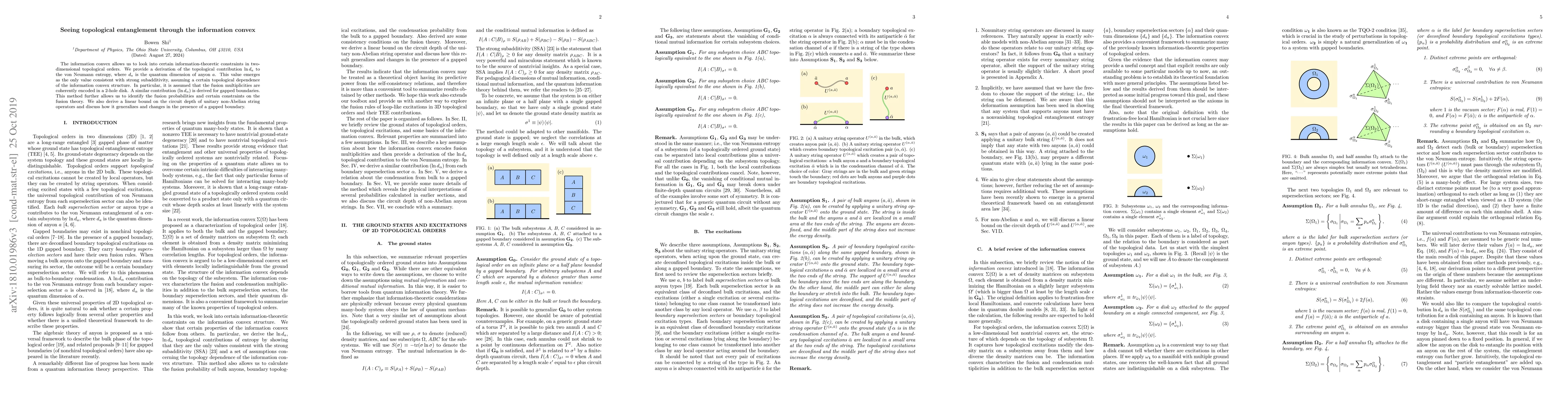 The information convex allows us to look into certain information-theoretic constraints in two-dimensional topological orders. We provide a derivation of the topological contribution $\ln d_a$ to the von Neumann entropy, where $d_a$ is the quantum dimension of anyon $a$. This value emerges as the only value consistent with strong subadditivity, assuming a certain topological dependence of the information convex structure. In particular, it is assumed that the fusion multiplicities are coherently encoded in a 2-hole disk. A similar contribution ($\ln d_{\alpha}$) is derived for gapped boundaries. This method further allows us to identify the fusion probabilities and certain constraints on the fusion theory. We also derive a linear bound on the circuit depth of unitary non-Abelian string operators and discuss how it generalizes and changes in the presence of a gapped boundary.
