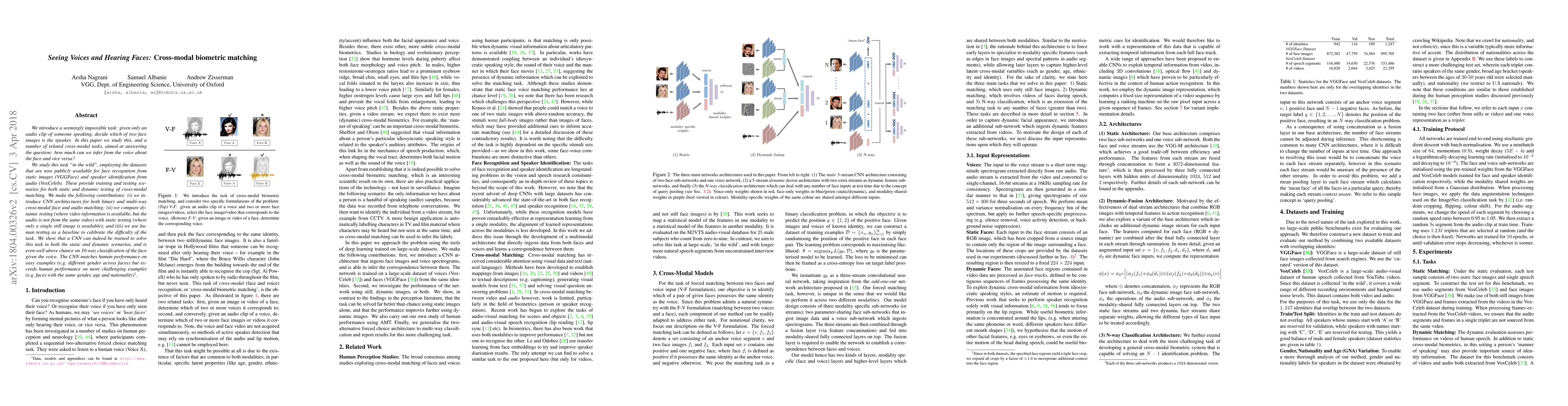 This paper explores cross-modal biometric matching by training CNNs to identify speakers from audio clips and match them to corresponding faces, comparing static and dynamic testing scenarios. The results show that CNNs can outperform humans on challenging matching tasks, indicating significant potential for cross-modal inference.