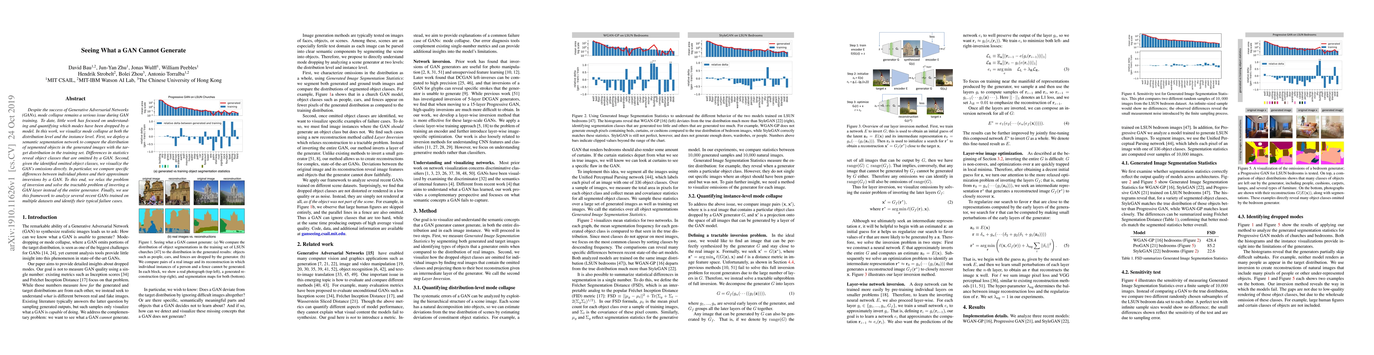 Despite the success of Generative Adversarial Networks (GANs), mode collapse remains a serious issue during GAN training. To date, little work has focused on understanding and quantifying which modes have been dropped by a model. In this work, we visualize mode collapse at both the distribution level and the instance level. First, we deploy a semantic segmentation network to compare the distribution of segmented objects in the generated images with the target distribution in the training set. Differences in statistics reveal object classes that are omitted by a GAN. Second, given the identified omitted object classes, we visualize the GAN's omissions directly. In particular, we compare specific differences between individual photos and their approximate inversions by a GAN. To this end, we relax the problem of inversion and solve the tractable problem of inverting a GAN layer instead of the entire generator. Finally, we use this framework to analyze several recent GANs trained on multiple datasets and identify their typical failure cases.