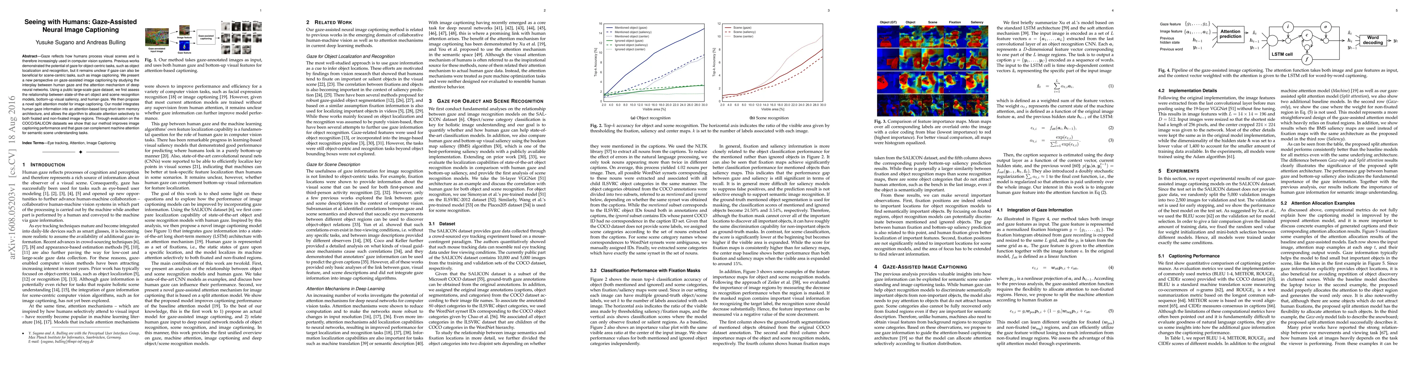 This paper explores the integration of human gaze into neural image captioning systems to enhance scene understanding. It proposes a split attention model that combines human gaze with deep neural network attention, demonstrating improved captioning performance on COCO and SALICON datasets.