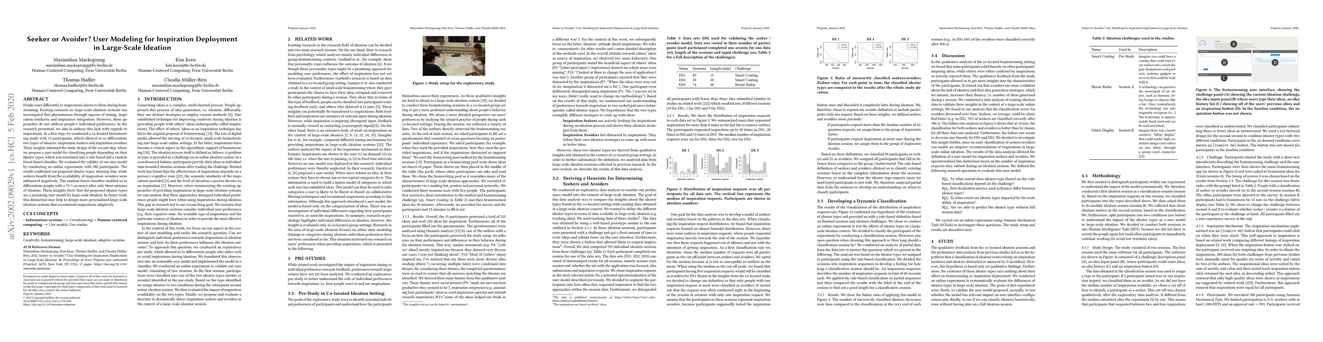 People react differently to inspirations shown to them during brainstorming. Existing research on large-scale ideation systems has investigated this phenomenon through aspects of timing, inspiration similarity and inspiration integration. However, these approaches do not address people's individual preferences. In the research presented, we aim to address this lack with regards to inspirations. In a first step, we conducted a co-located brainstorming study with 15 participants, which allowed us to differentiate two types of ideators: Inspiration seekers and inspiration avoiders. These insights informed the study design of the second step, where we propose a user model for classifying people depending on their ideator types, which was translated into a rule-based and a random forest-based classifier. We evaluated the validity of our user model by conducting an online experiment with 380 participants. The results confirmed our proposed ideator types, showing that, while seekers benefit from the availability of inspiration, avoiders were influenced negatively. The random forest classifier enabled us to differentiate people with a 73 \% accuracy after only three minutes of ideation. These insights show that the proposed ideator types are a promising user model for large-scale ideation. In future work, this distinction may help to design more personalized large-scale ideation systems that recommend inspirations adaptively.