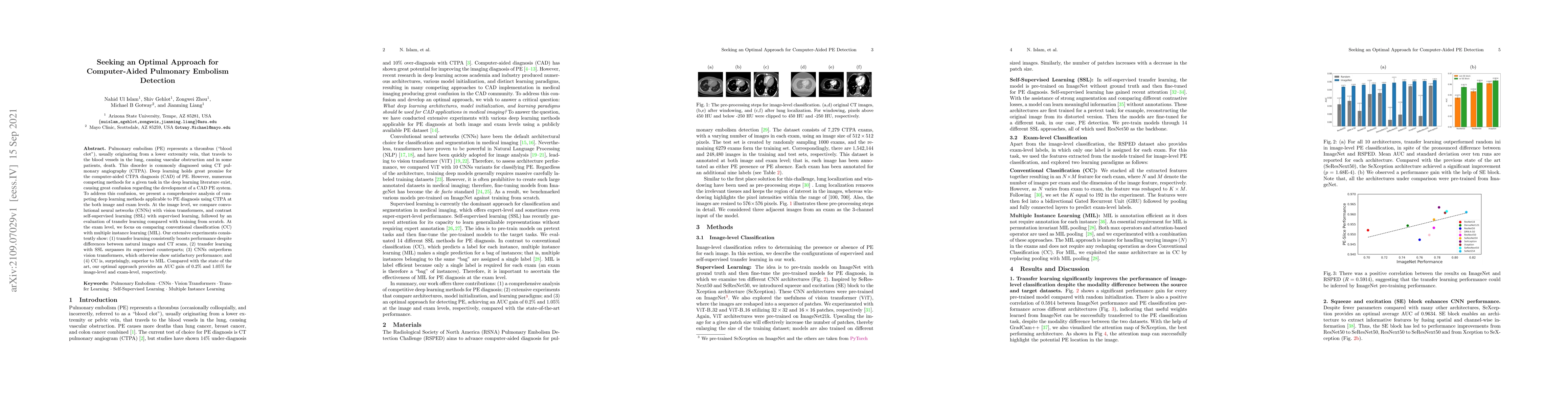 This paper conducts a comprehensive analysis of various deep learning methods for computer-aided diagnosis of pulmonary embolism using CT pulmonary angiography. The study finds that transfer learning, especially with self-supervised learning, outperforms supervised learning and training from scratch, while convolutional neural networks are superior to vision transformers. Conventional classification is better than multiple instance learning. The proposed optimal approach achieves notable improvements over the state-of-the-art in both image-level and exam-level evaluations.