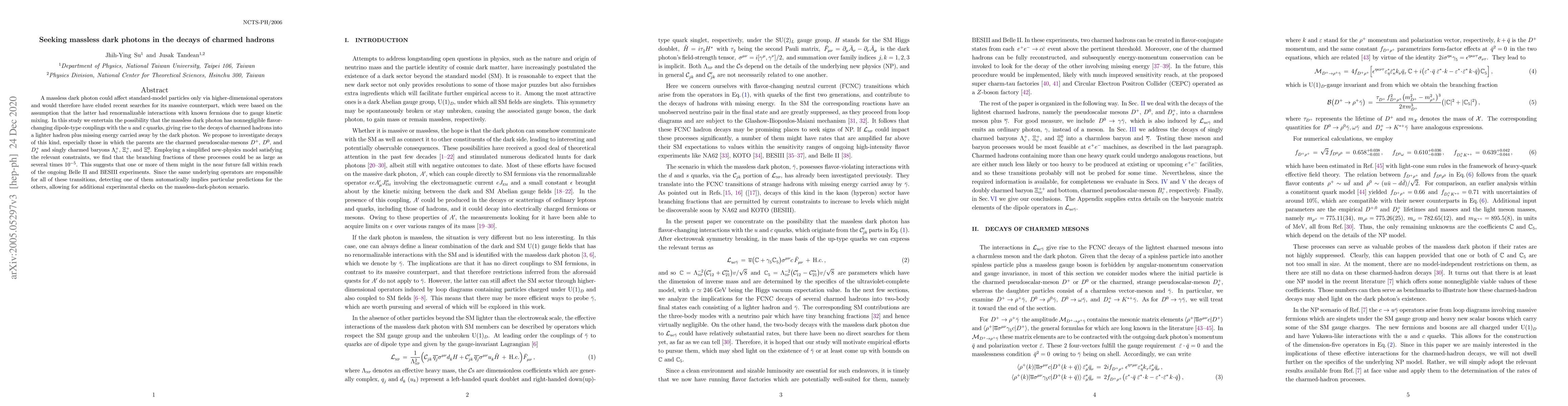 A massless dark photon could affect standard-model particles only via higher-dimensional operators and would therefore have eluded recent searches for its massive counterpart, which were based on the assumption that the latter had renormalizable interactions with known fermions due to gauge kinetic mixing. In this study we entertain the possibility that the massless dark photon has nonnegligible flavor-changing dipole-type couplings with the $u$ and $c$ quarks, giving rise to the decays of charmed hadrons into a lighter hadron plus missing energy carried away by the dark photon. We propose to investigate decays of this kind, especially those in which the parents are the charmed pseudoscalar-mesons $D^+$, $D^0$, and $D_s^+$ and singly charmed baryons $\Lambda_c^+$, $\Xi_c^+$, and $\Xi_c^0$. Employing a simplified new-physics model satisfying the relevant constraints, we find that the branching fractions of these processes could be as large as several times $10^{-5}$. This suggests that one or more of them might in the near future fall within reach of the ongoing Belle II and BESIII experiments. Since the same underlying operators are responsible for all of these transitions, detecting one of them automatically implies particular predictions for the others, allowing for additional experimental checks on the massless-dark-photon scenario.