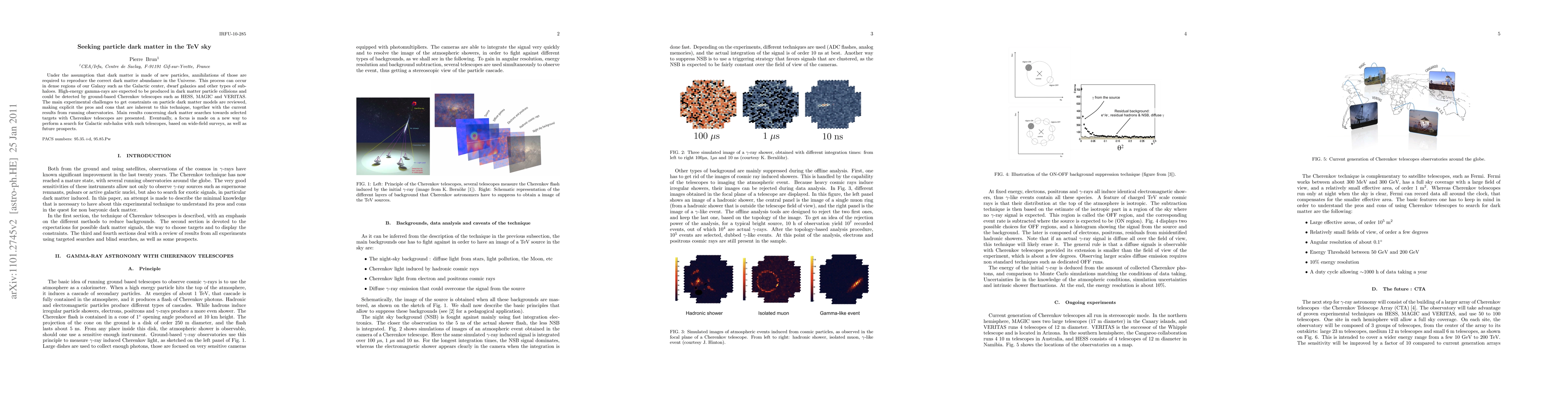 This paper discusses the search for dark matter particles using ground-based Cherenkov telescopes like HESS, MAGIC, and VERITAS. It outlines the methodology, challenges, and results of detecting high-energy gamma-rays produced in dark matter particle collisions, focusing on specific Galactic targets and proposing wide-field surveys for subhalo detection.