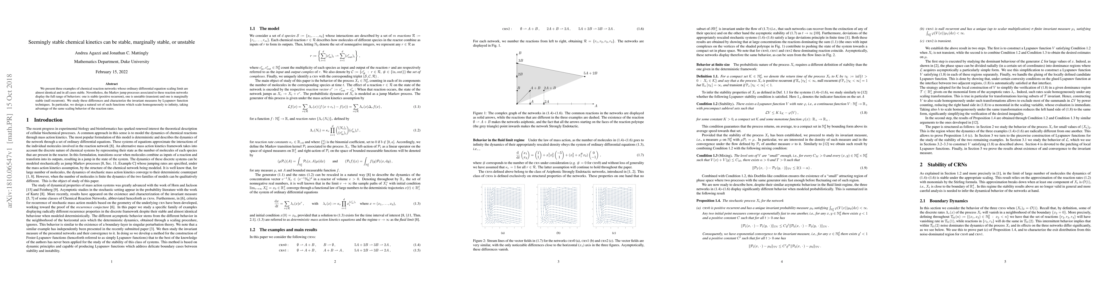 We present three examples of chemical reaction networks whose ordinary differential equation scaling limit are almost identical and in all cases stable. Nevertheless, the Markov jump processes associated to these reaction networks display the full range of behaviors: one is stable (positive recurrent), one is unstable (transient) and one is marginally stable (null recurrent). We study these differences and characterize the invariant measures by Lyapunov function techniques. In particular, we design a natural set of such functions which scale homogeneously to infinity, taking advantage of the same scaling behavior of the reaction rates.