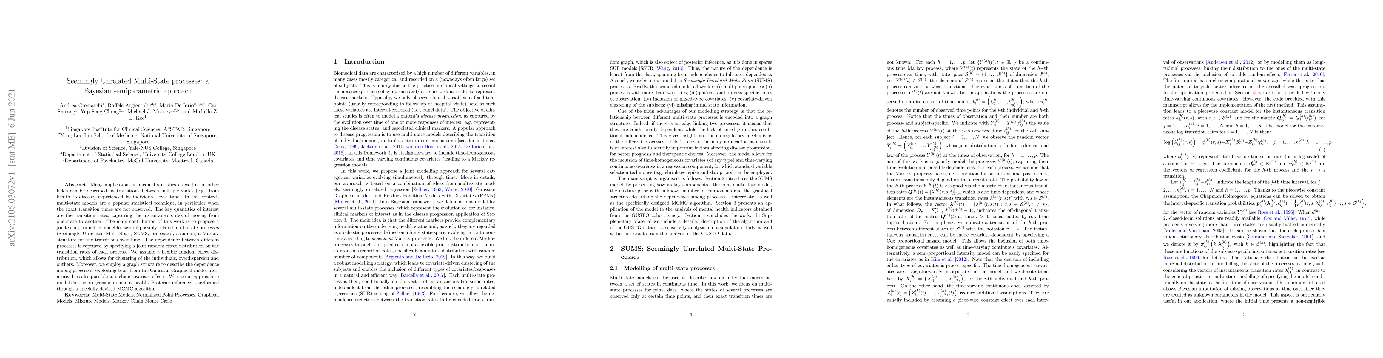 This paper proposes a Bayesian semiparametric model for Seemingly Unrelated Multi-State (SUMS) processes, capturing transitions between multiple states with a joint random effect distribution and Markov structure. The approach uses a flexible random effect distribution and a graph structure to model dependencies among processes, and is applied to model disease progression in mental health using a custom MCMC algorithm.