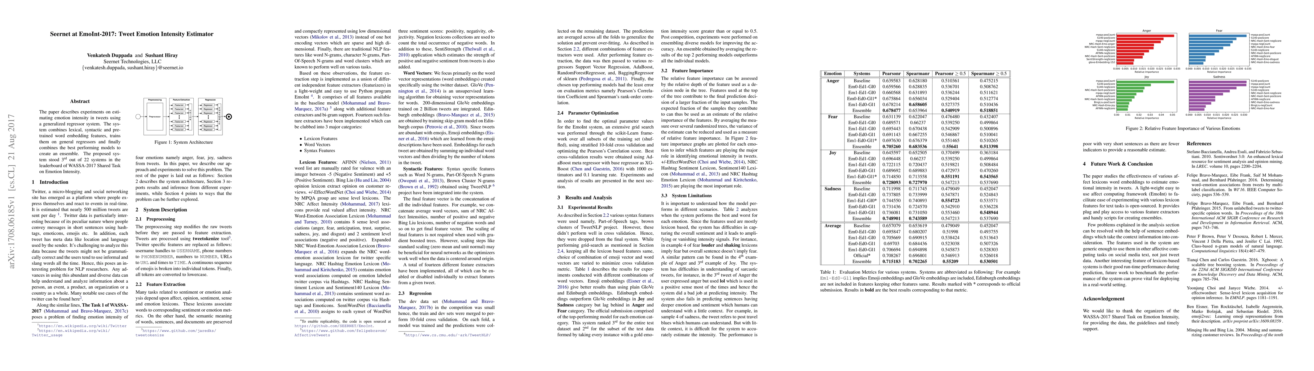 The paper describes experiments on estimating emotion intensity in tweets using a generalized regressor system. The system combines lexical, syntactic and pre-trained word embedding features, trains them on general regressors and finally combines the best performing models to create an ensemble. The proposed system stood 3rd out of 22 systems in the leaderboard of WASSA-2017 Shared Task on Emotion Intensity.