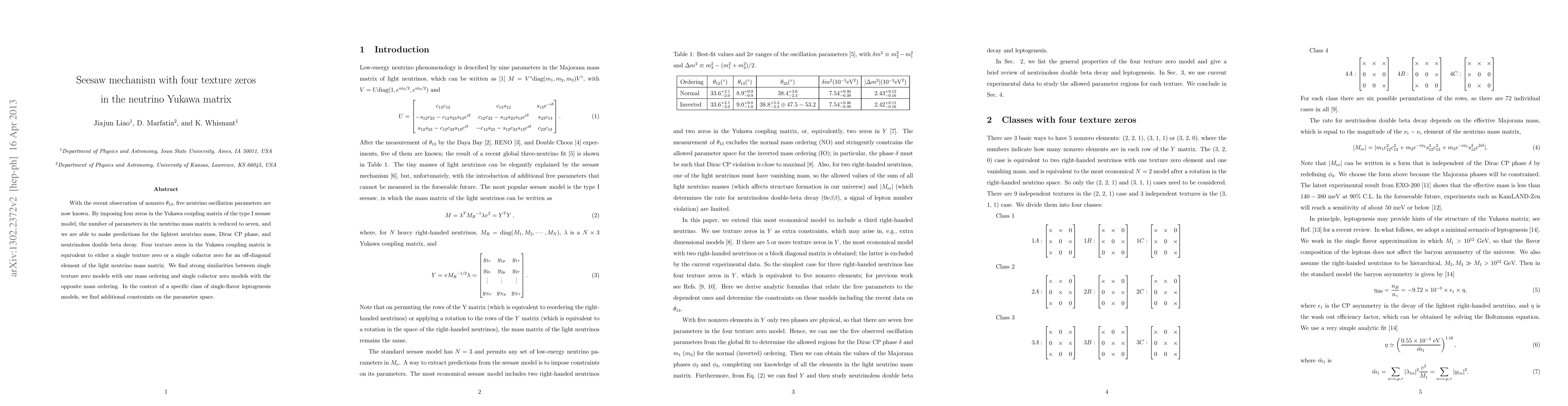 With the recent observation of nonzero \theta_{13}, five neutrino oscillation parameters are now known. By imposing four zeros in the Yukawa coupling matrix of the type I seesaw model, the number of parameters in the neutrino mass matrix is reduced to seven, and we are able to make predictions for the lightest neutrino mass, Dirac CP phase, and neutrinoless double beta decay. Four texture zeros in the Yukawa coupling matrix is equivalent to either a single texture zero or a single cofactor zero for an off-diagonal element of the light neutrino mass matrix. We find strong similarities between single texture zero models with one mass ordering and single cofactor zero models with the opposite mass ordering. In the context of a specific class of single-flavor leptogenesis models, we find additional constraints on the parameter space.