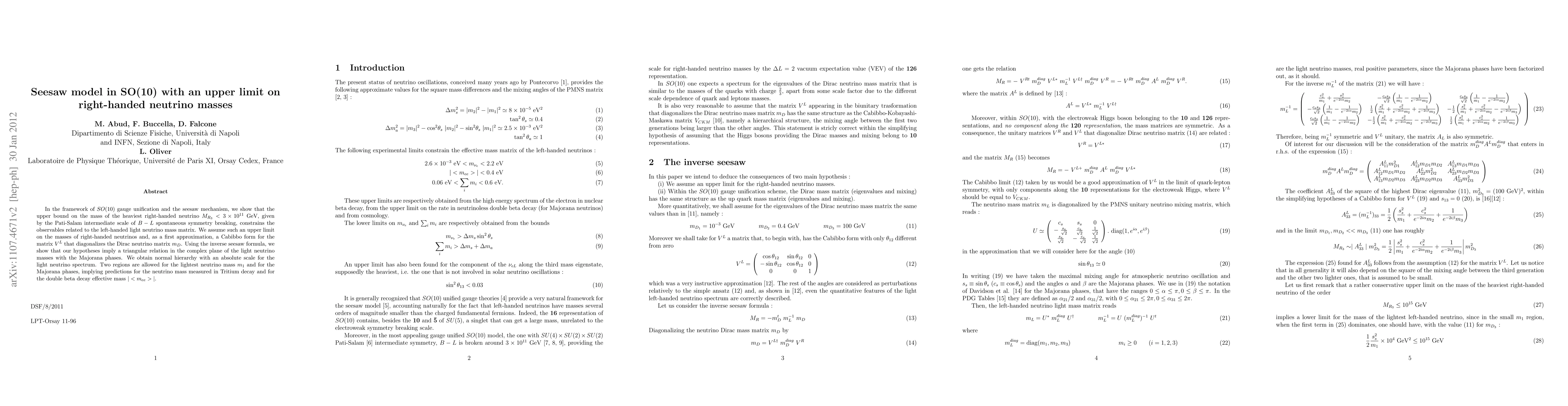 This paper explores the SO(10) gauge unification within the seesaw model, establishing an upper limit on the heaviest right-handed neutrino mass $M_{R_3} < 3 \times 10^{11}$ GeV, which constrains the left-handed light neutrino mass matrix. It predicts a normal hierarchy for light neutrino masses and specific regions for the lightest neutrino mass and Majorana phases, with implications for Tritium decay and double beta decay.