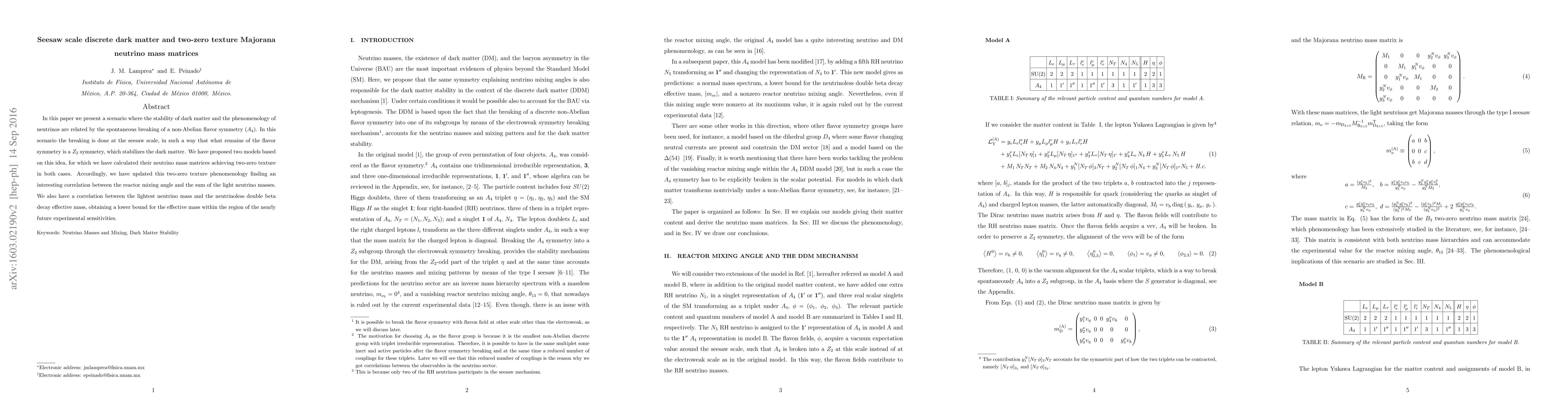 In this paper we present a scenario where the stability of dark matter and the phenomenology of neutrinos are related by the spontaneous breaking of a non-Abelian flavor symmetry. In this scenario the breaking is done at the seesaw scale, in such a way that what remains of the flavor symmetry is a Z2 symmetry, which stabilizes the dark matter. We have proposed two models based on this idea, for which we have calculated their neutrino mass matrices achieving two-zero texture in both cases. Accordingly, we have updated this two-zero texture phenomenology finding an interesting correlation between the reactor mixing angle and the sum of the light neutrino masses. We also have a correlation between the lightest neutrino mass and the neutrinoless double beta decay effective mass, obtaining a lower bound for the effective mass within the region of the nearly future experimental sensitivities.