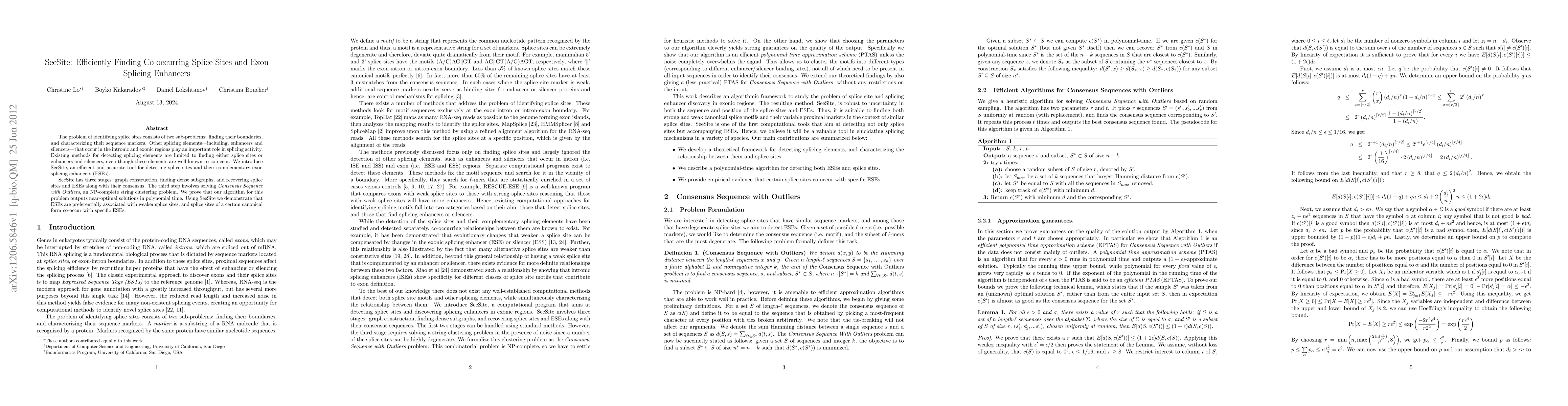 The problem of identifying splice sites consists of two sub-problems: finding their boundaries, and characterizing their sequence markers. Other splicing elements---including, enhancers and silencers---that occur in the intronic and exonic regions play an important role in splicing activity. Existing methods for detecting splicing elements are limited to finding either splice sites or enhancers and silencers, even though these elements are well-known to co-occur. We introduce SeeSite, an efficient and accurate tool for detecting splice sites and their complementary exon splicing enhancers (ESEs). SeeSite has three stages: graph construction, finding dense subgraphs, and recovering splice sites and ESEs along with their consensus. The third step involves solving Consensus Sequence with Outliers, an NP-complete string clustering problem. We prove that our algorithm for this problem outputs near-optimal solutions in polynomial time. Using SeeSite we demonstrate that ESEs are preferentially associated with weaker splice sites, and splice sites of a certain canonical form co-occur with specific ESEs.