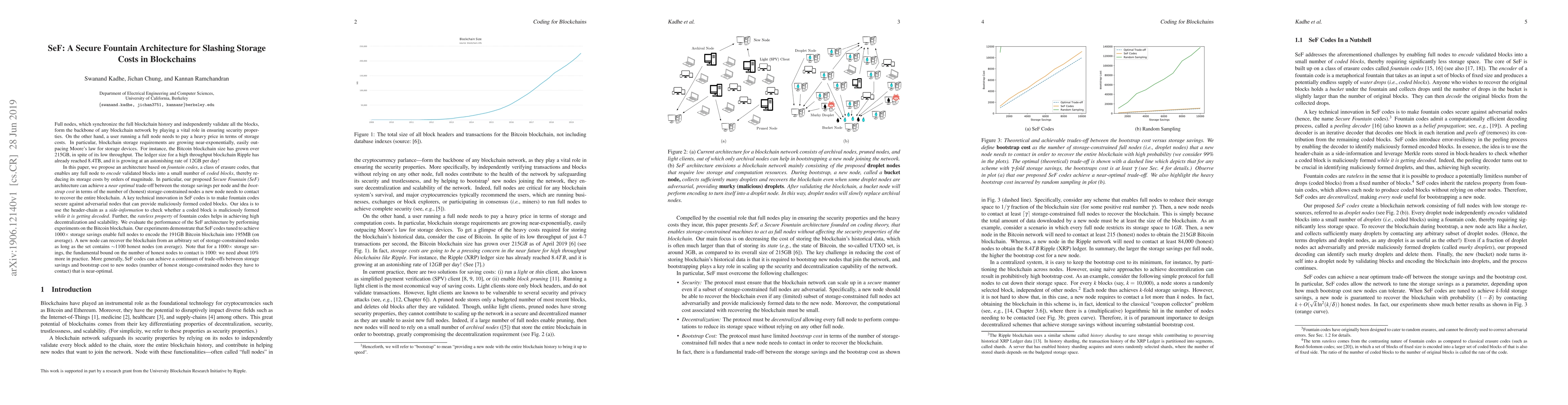 A new blockchain architecture called Secure Fountain (SeF) reduces storage costs for full nodes by encoding validated blocks into a small number of coded blocks, achieving 1000x storage savings on average.