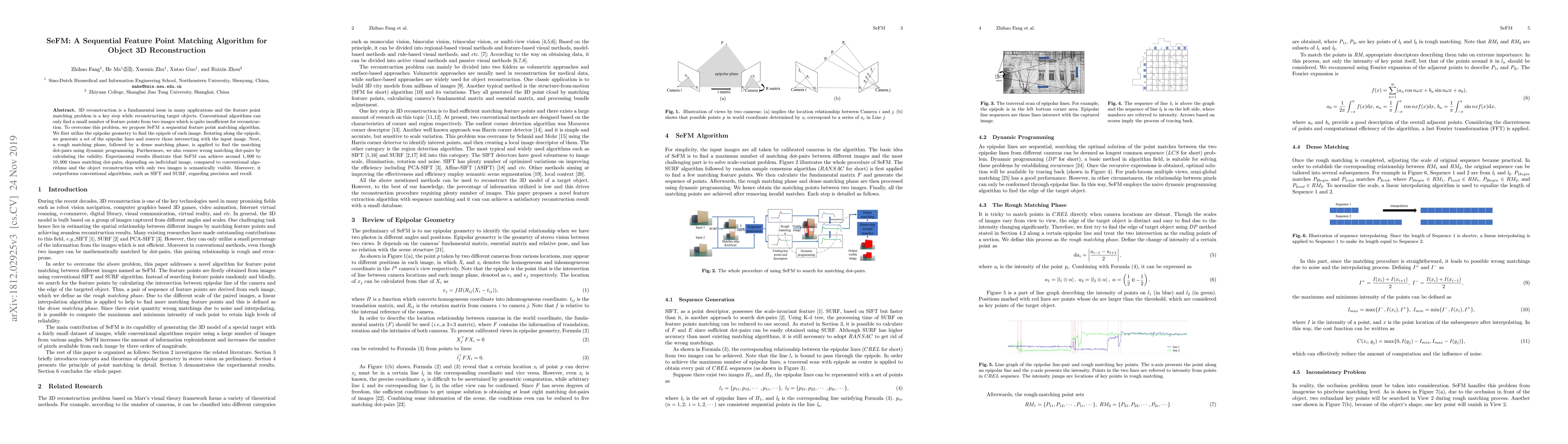SeFM proposes a sequential feature point matching algorithm for 3D object reconstruction, achieving 1,000 to 10,000 times more matching dot-pairs than conventional algorithms.