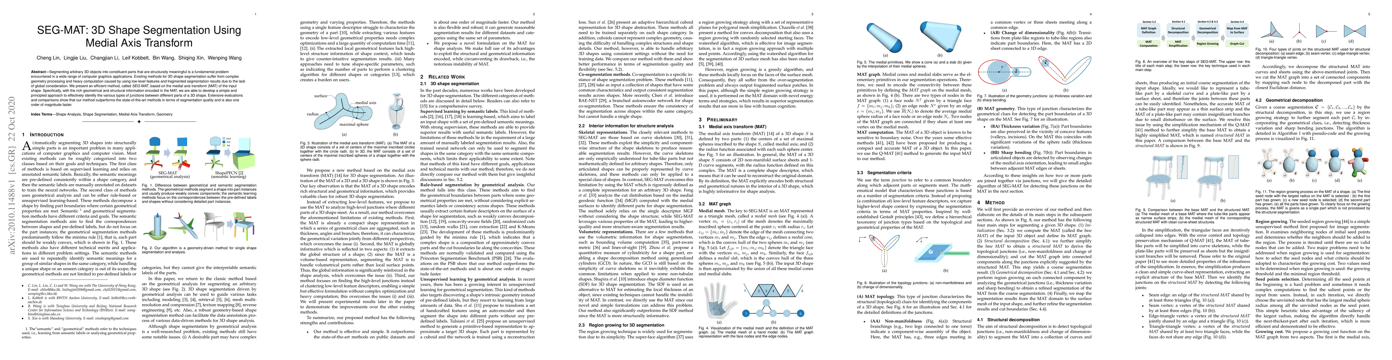 SEG-MAT leverages the medial axis transform (MAT) for efficient 3D shape segmentation, identifying structural junctions with high accuracy and speed, outperforming existing methods in both quality and computational efficiency.