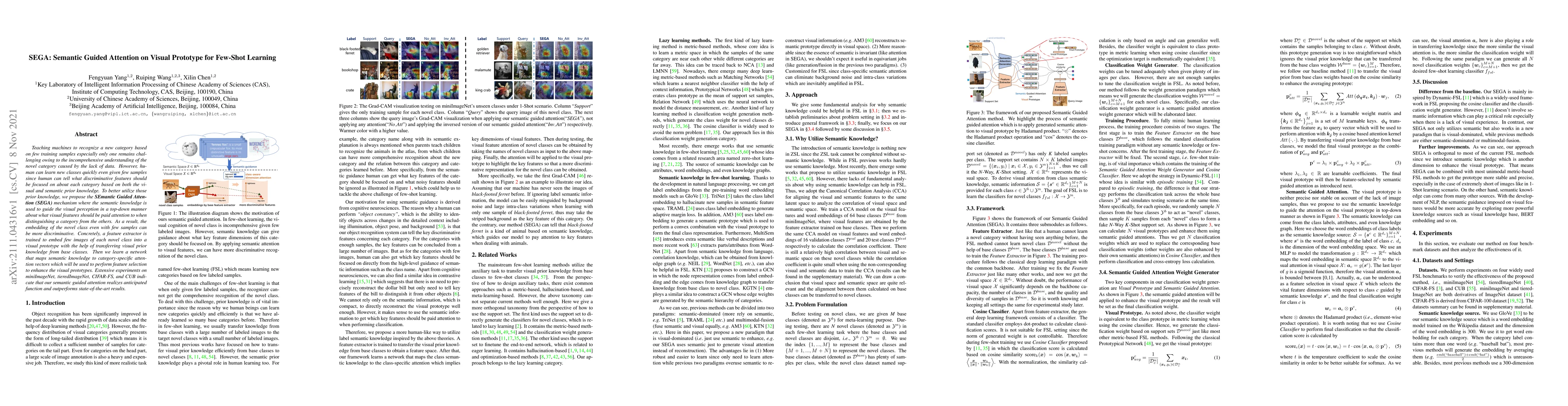 The SEGA mechanism proposes a semantic guided attention approach to enhance few-shot learning by leveraging both visual and semantic prior knowledge to focus on discriminative features. Experiments show it outperforms state-of-the-art methods on several datasets.
