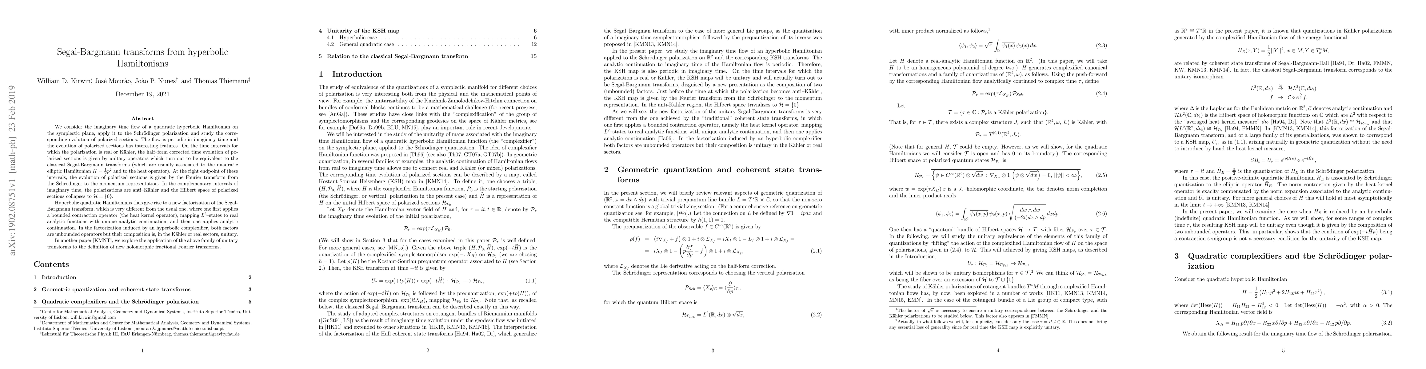 We consider the imaginary time flow of a quadratic hyperbolic Hamiltonian on the symplectic plane, apply it to the Schr\"odinger polarization and study the corresponding evolution of polarized sections. The flow is periodic in imaginary time and the evolution of polarized sections has interesting features. On the time intervals for which the polarization is real or K\"ahler, the half--form corrected time evolution of polarized sections is given by unitary operators which turn out to be equivalent to the classical Segal-Bargmann transforms (which are usually associated to the quadratic elliptic Hamiltonian $H=\frac12 p^2$ and to the heat operator). At the right endpoint of these intervals, the evolution of polarized sections is given by the Fourier transform from the Schr\"odinger to the momentum representation. In the complementary intervals of imaginary time, the polarizations are anti--K\"ahler and the Hilbert space of polarized sections collapses to ${\mathcal H}= \{0\}$. Hyperbolic quadratic Hamiltonians thus give rise to a new factorization of the Segal-Bargmann transform, which is very different from the usual one, where one first applies a bounded contraction operator (the heat kernel operator), mapping $L^2$--states to real analytic functions with unique analytic continuation, and then one applies analytic continuation. In the factorization induced by an hyperbolic complexifier, both factors are unbounded operators but their composition is, in the K\"ahler or real sectors, unitary. In another paper [KMNT], we explore the application of the above family of unitary transforms to the definition of new holomorphic fractional Fourier transforms.